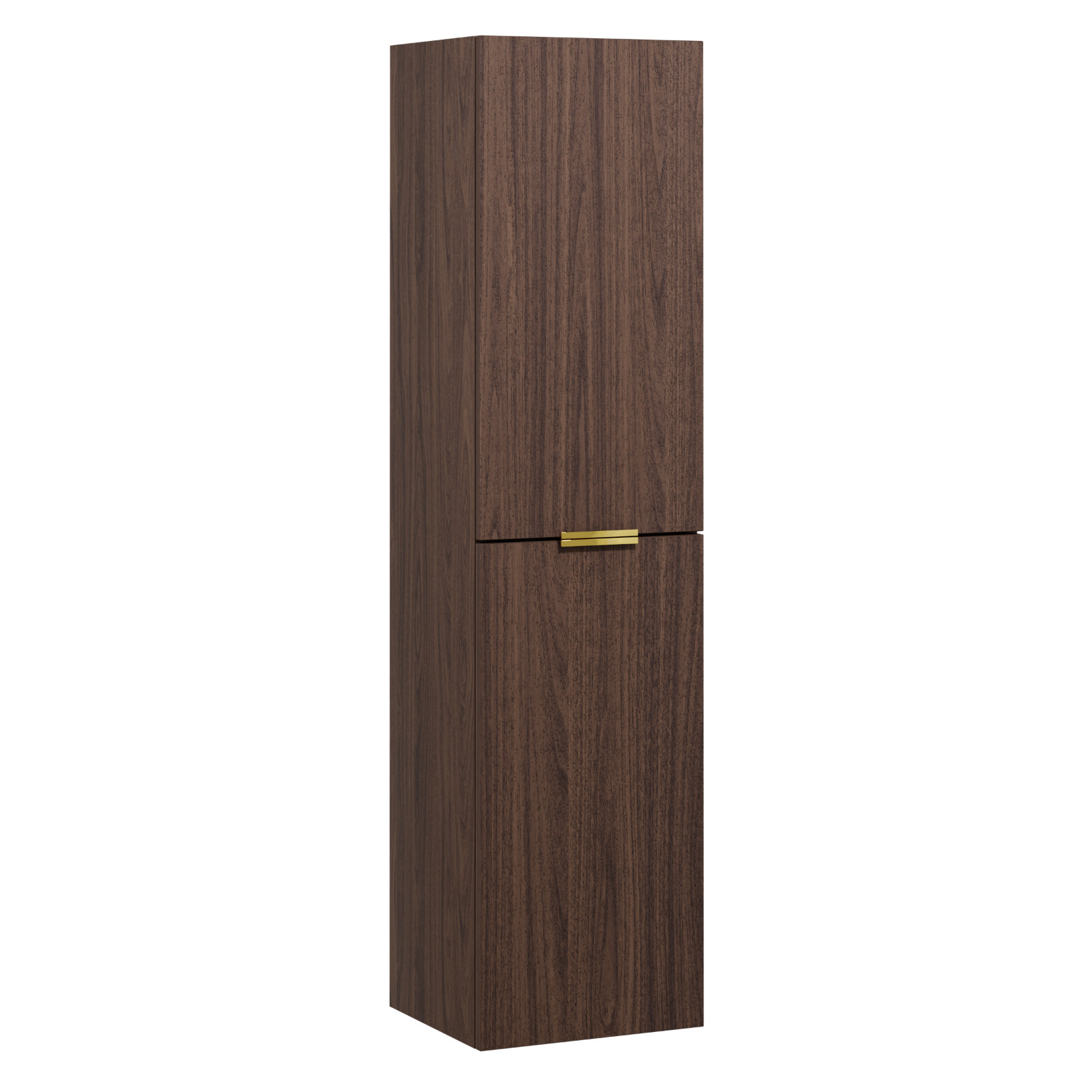 Saját márkás 35 cm széles függesztett fali magasszekrény mogyoró színben, szálcsiszolt arany fogantyúkkal, 4 db polccal és önbehúzós technológiával.