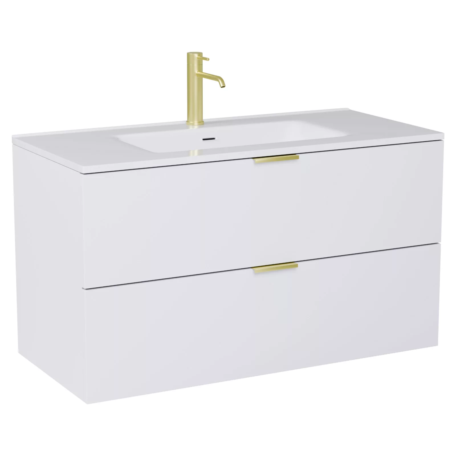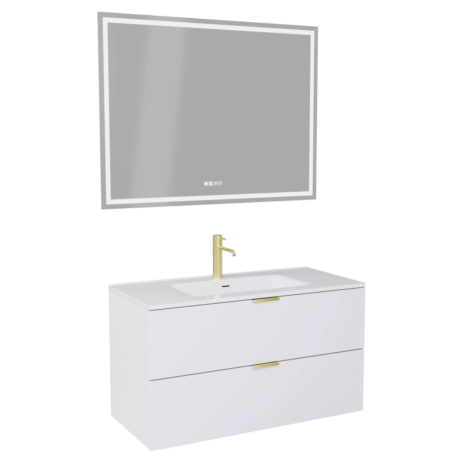 Palermo Matt White 100 komplett fürdőszoba bútor, szálcsiszolt arany fogantyúkkal