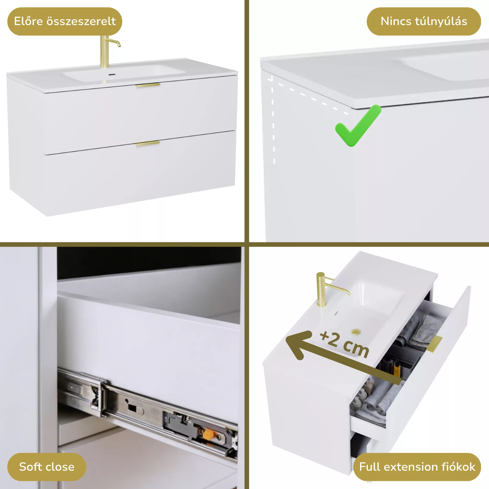 matt fehér mosdószekrény, teljes kihúzhatóságú fiókokkal