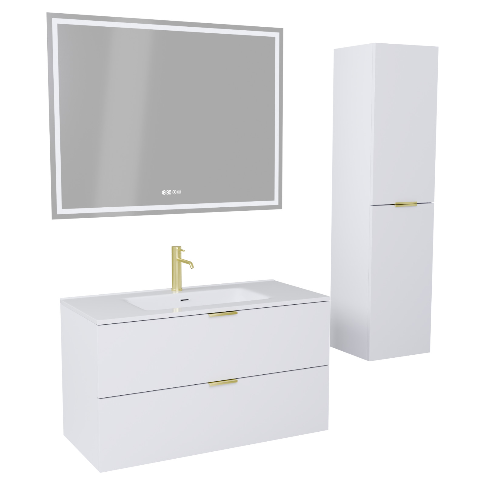 Palermo Matt White 100 komplett fürdőszoba bútor szett, szálcsiszolt arany fogantyúkkal