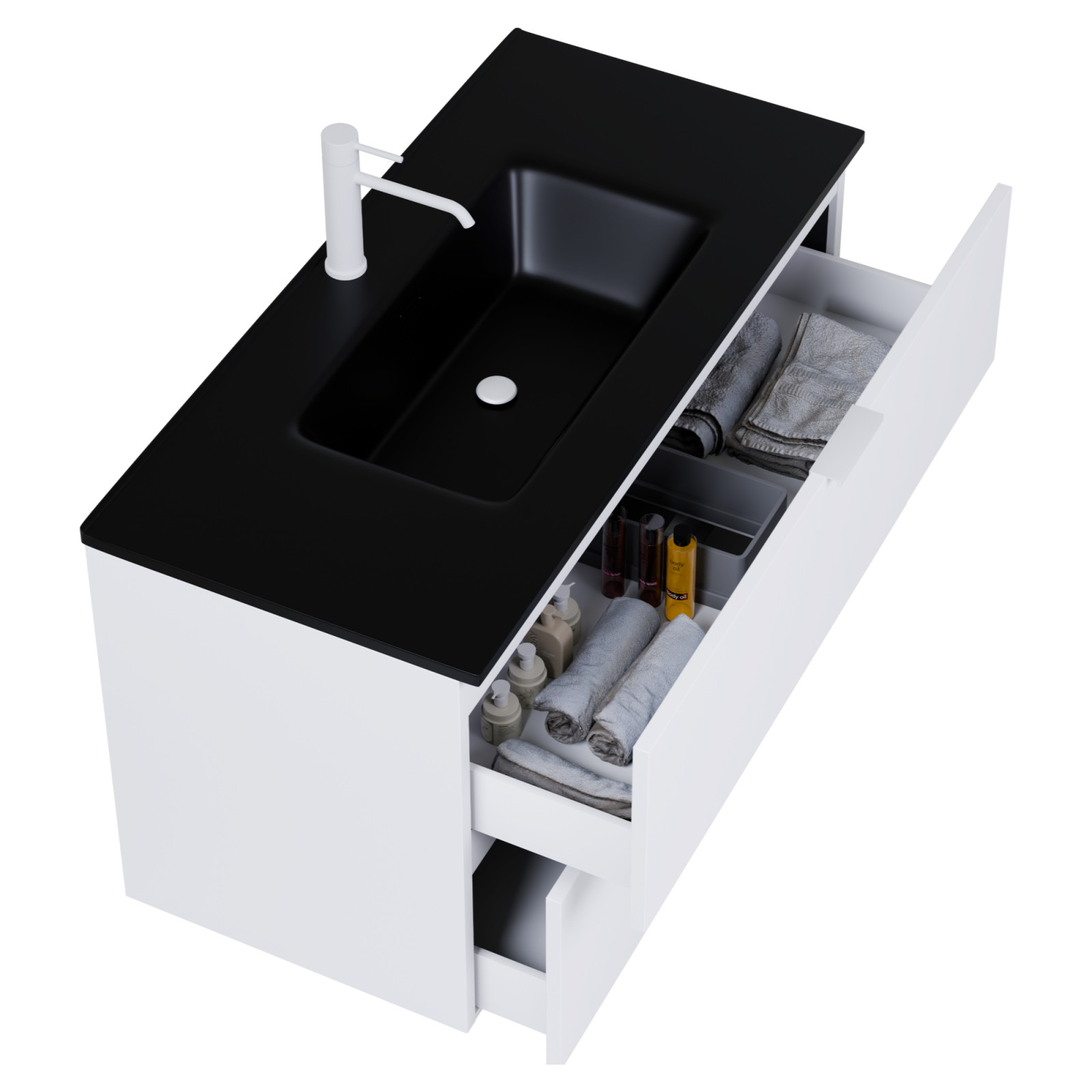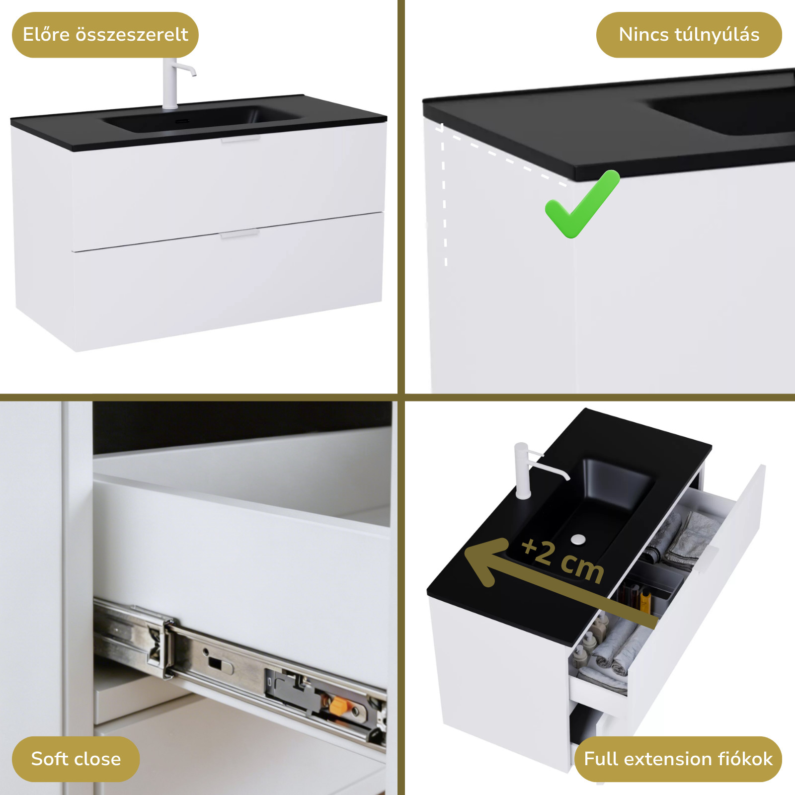 matt fehér mosdószekrény, teljes kihúzhatóságú fiókokkal