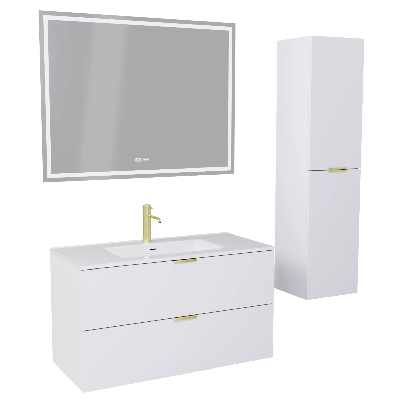 Saját márkás 100 cm széles komplett fürdőszoba bútor fali mosdószekrénnyel matt fehér színben, szálcsiszolt arany fogantyúkkal, okos LED tükörrel és magasszekrénnyel.