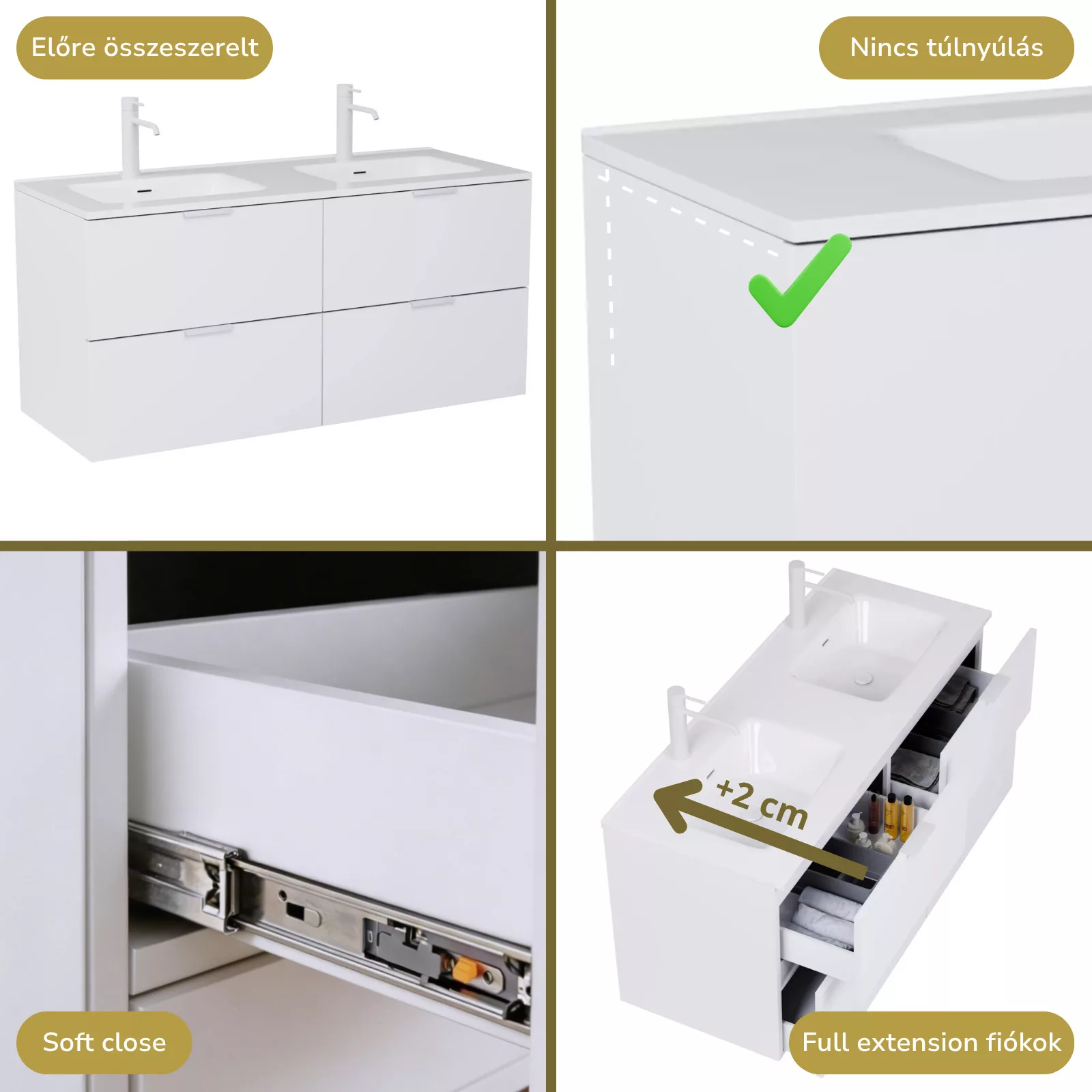 Saját márkás 120 cm széles fali mosdószekrény matt fehér színben, matt fehér fogantyúkkal, rejtett fióksínnel és önbehúzos technológiával ellátott.