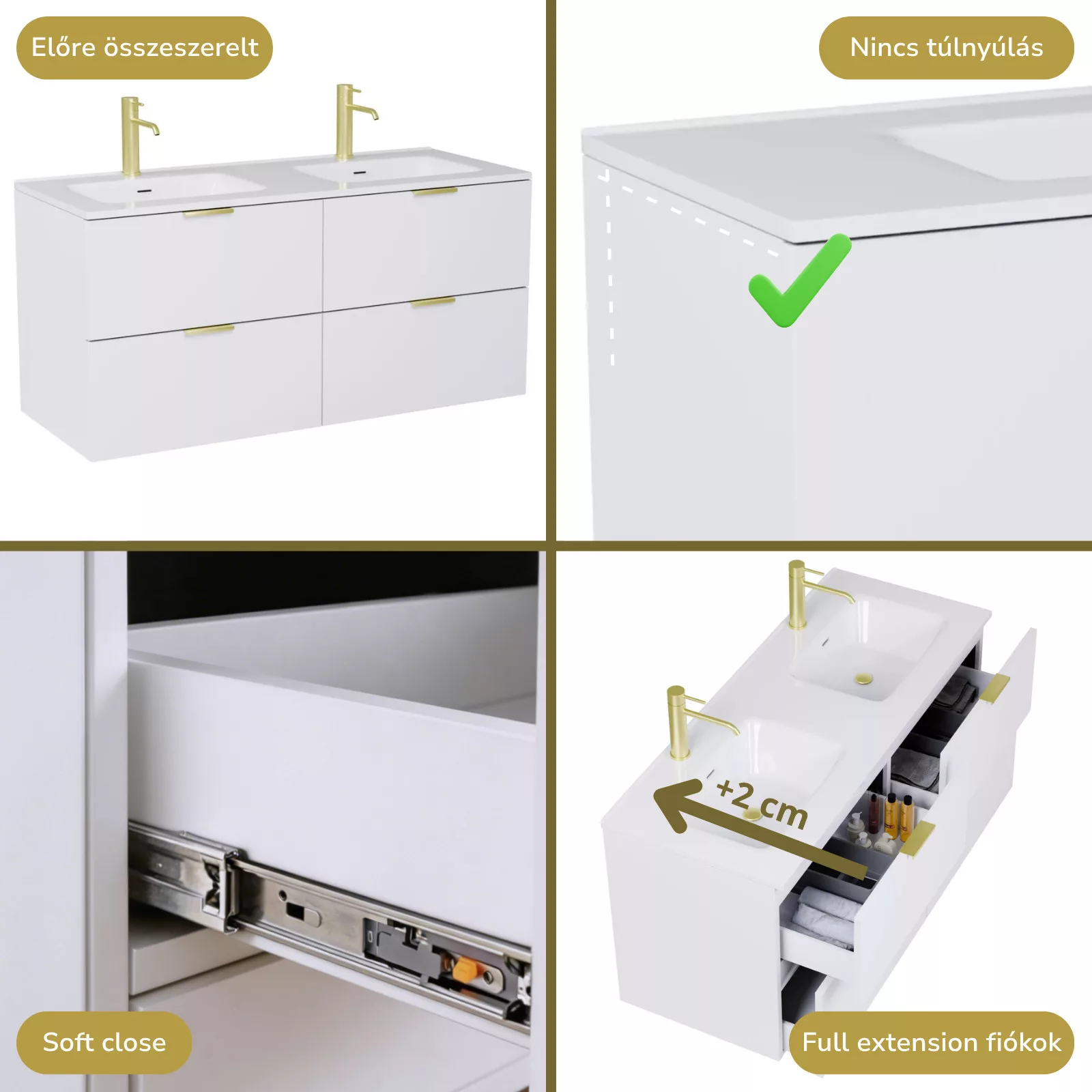 Saját márkás 120 cm széles fali mosdószekrény matt fehér színben, szálcsiszolt arany fogantyúkkal, rejtett fióksínnel és önbehúzos technológiával ellátott.