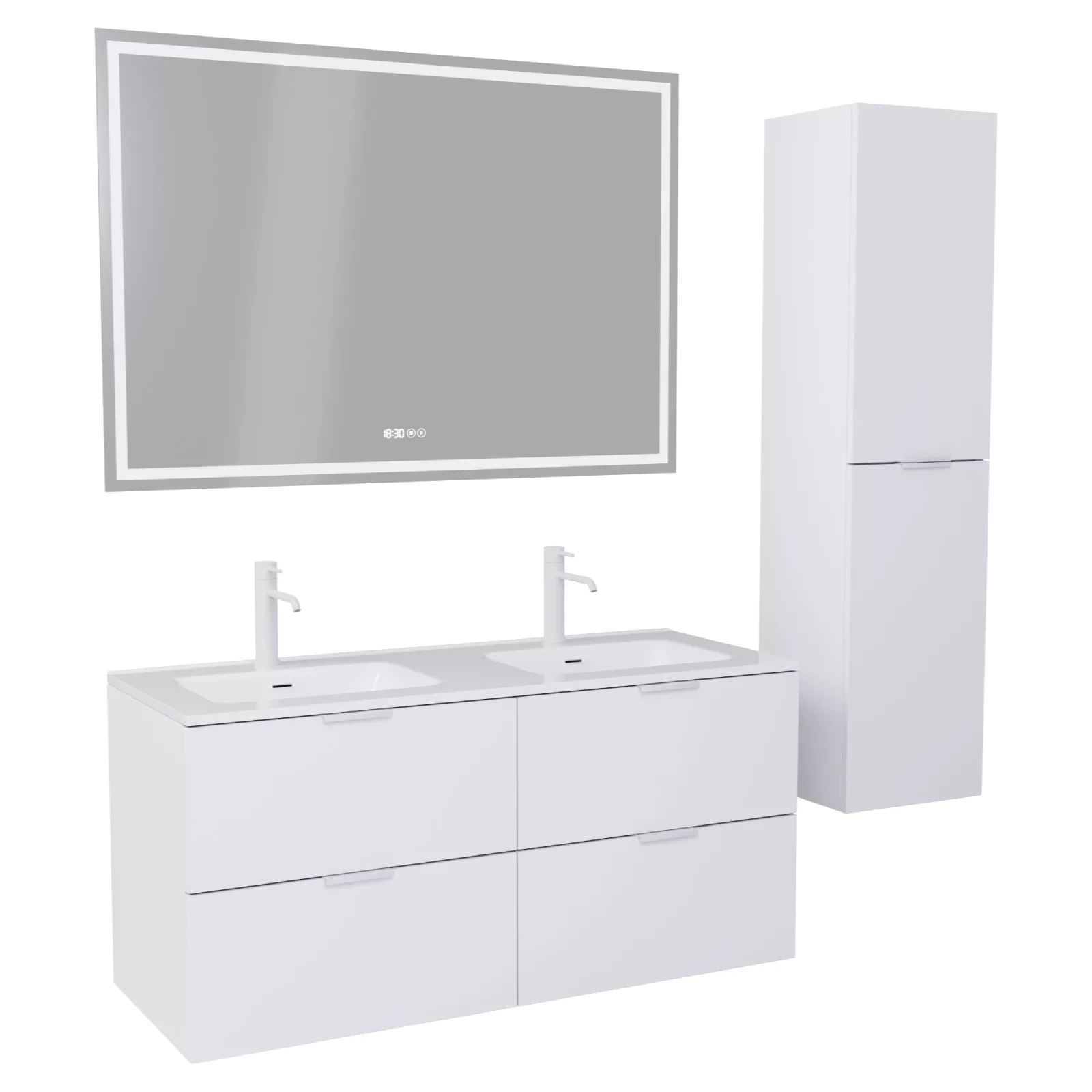 Saját márkás 120 cm széles komplett fürdőszoba bútor fali mosdószekrénnyel matt fehér színben, matt fehér fogantyúkkal, okos LED tükörrel és magasszekrénnyel.