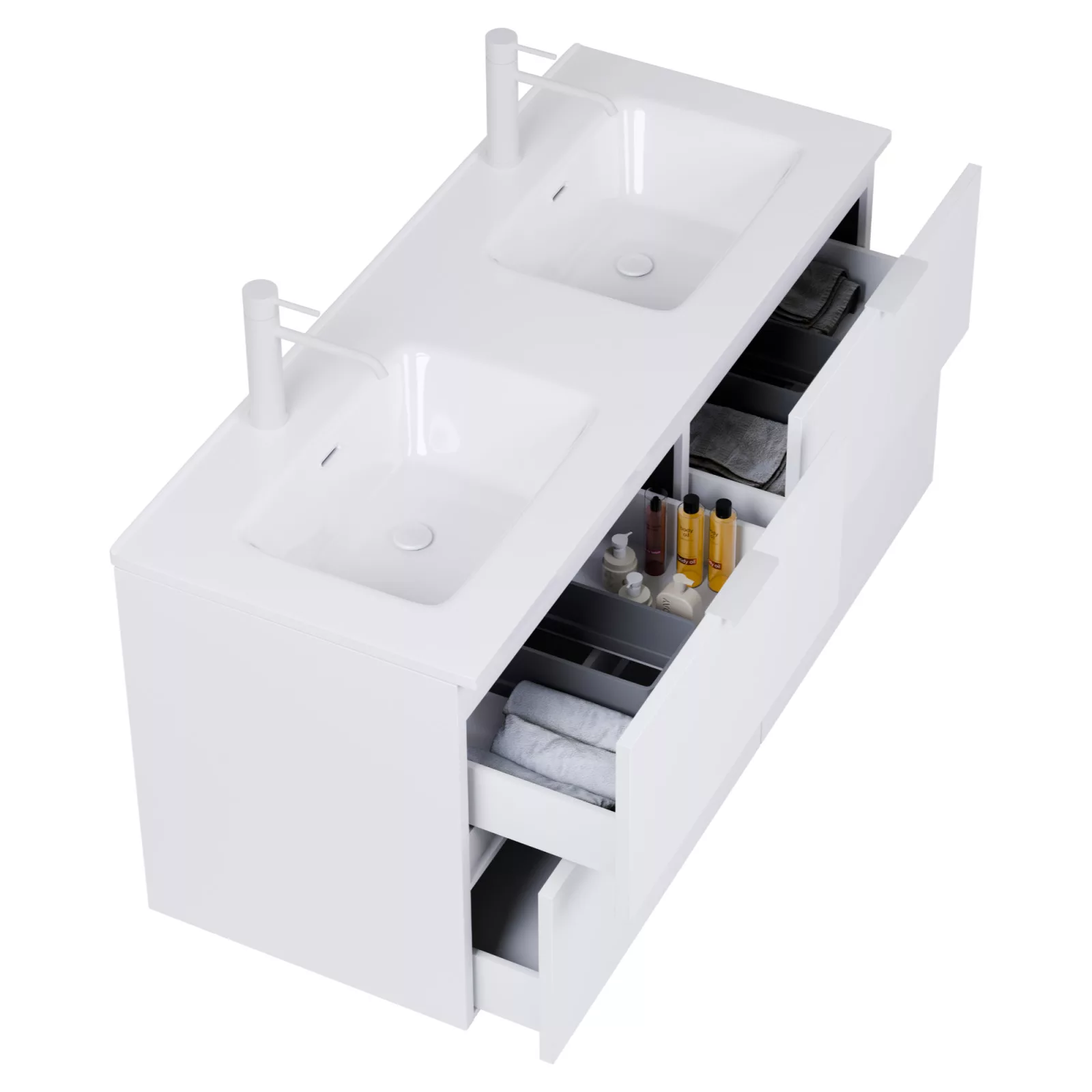 • matt fehér mosdószekrény, teljes kihúzhatóságú fiókokkal