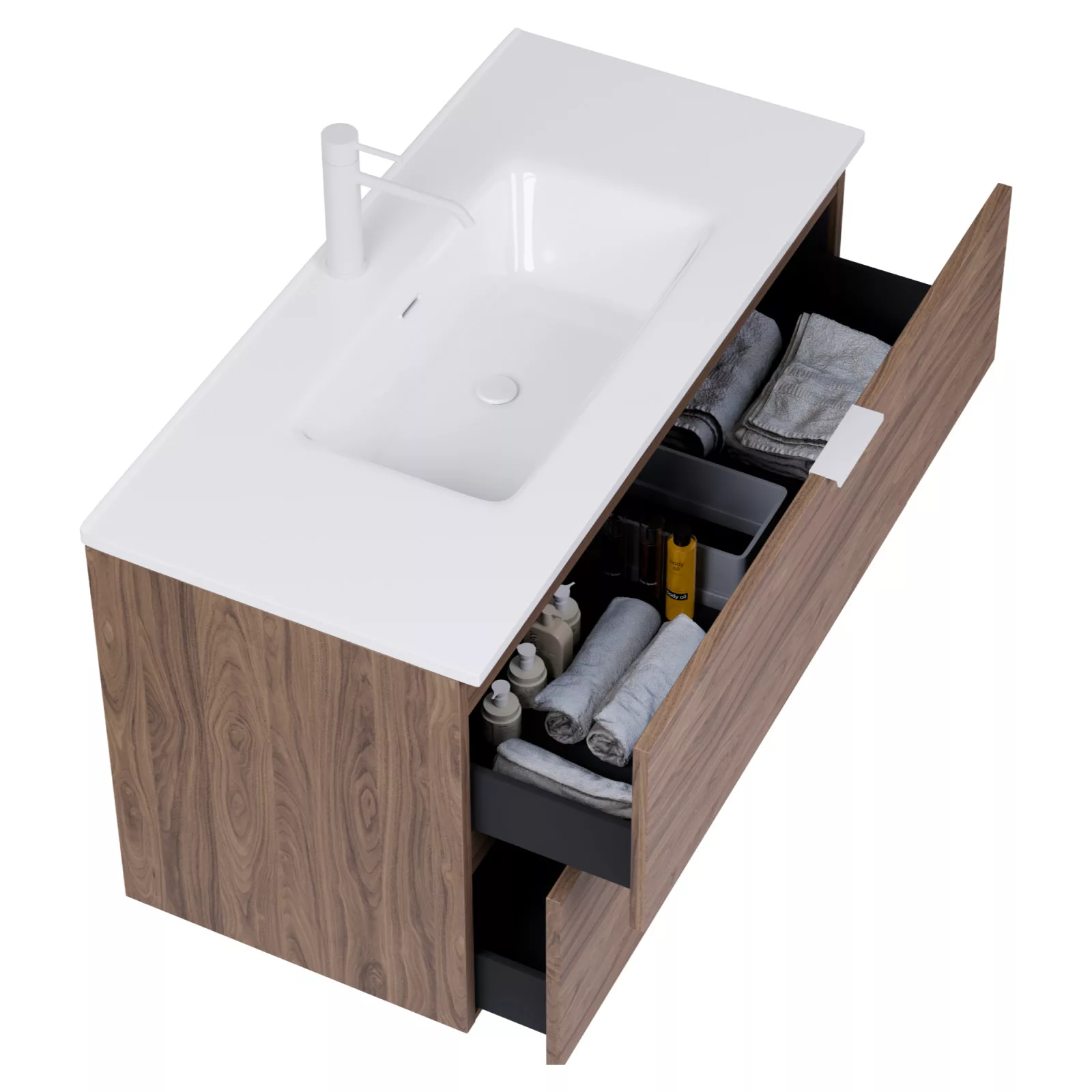 Saját márkás 100 cm széles fali mosdószekrény tölgyfa színben, matt fehér fogantyúkkal, rejtett fióksínnel és önbehúzos technológiával ellátott.