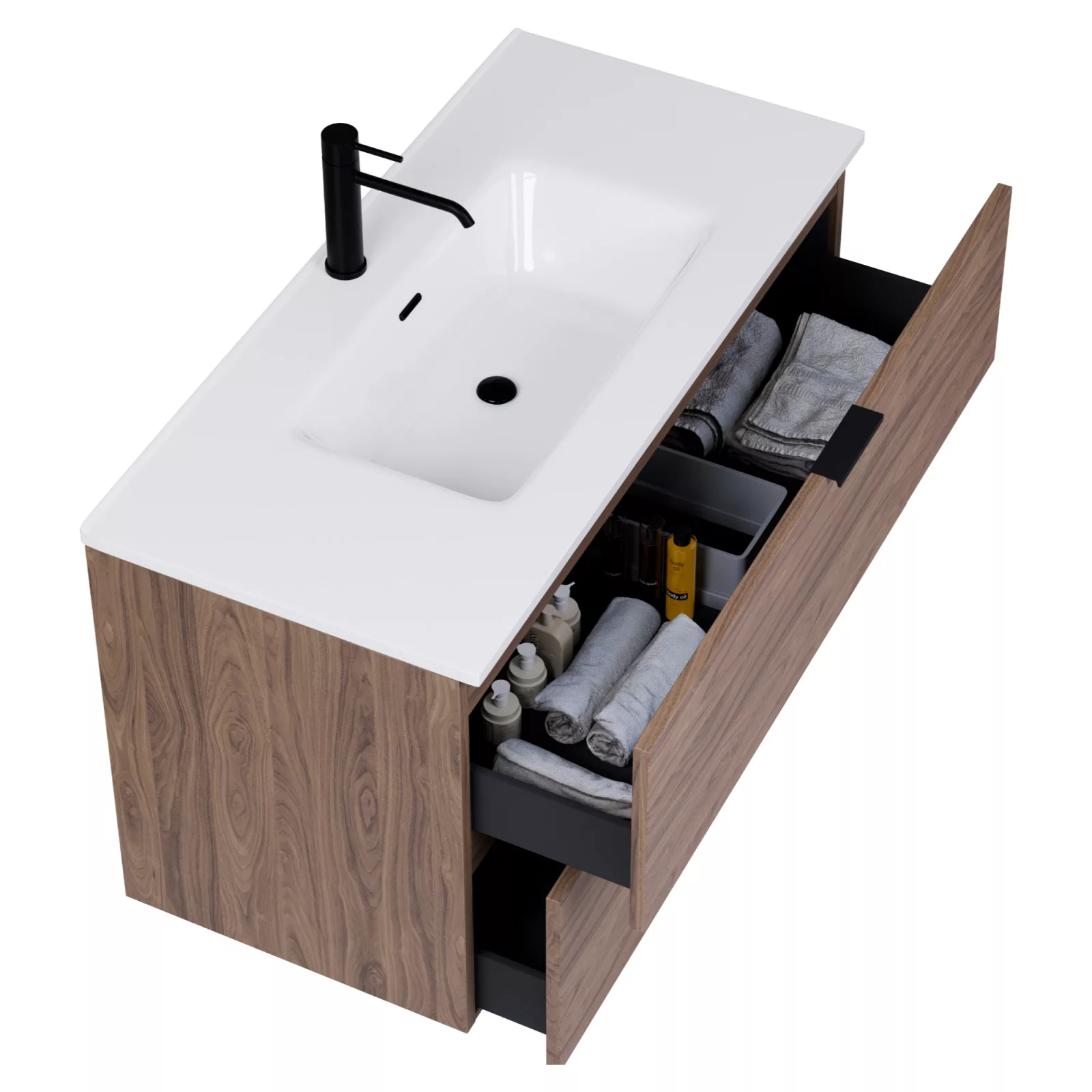 Saját márkás 100 cm széles fali mosdószekrény tölgyfa színben, matt fekete fogantyúkkal, rejtett fióksínnel és önbehúzos technológiával ellátott.