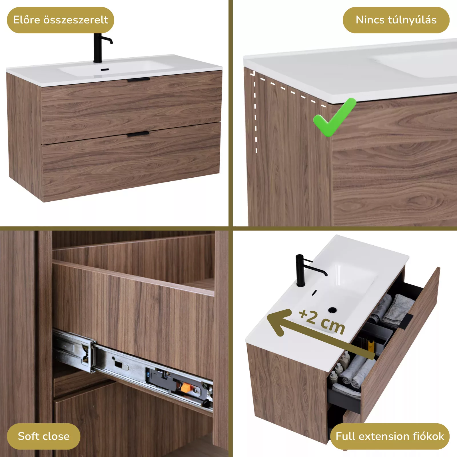 • tölgyfa színű mosdószerkény, teljes kihúzhatóságú fiókokkal