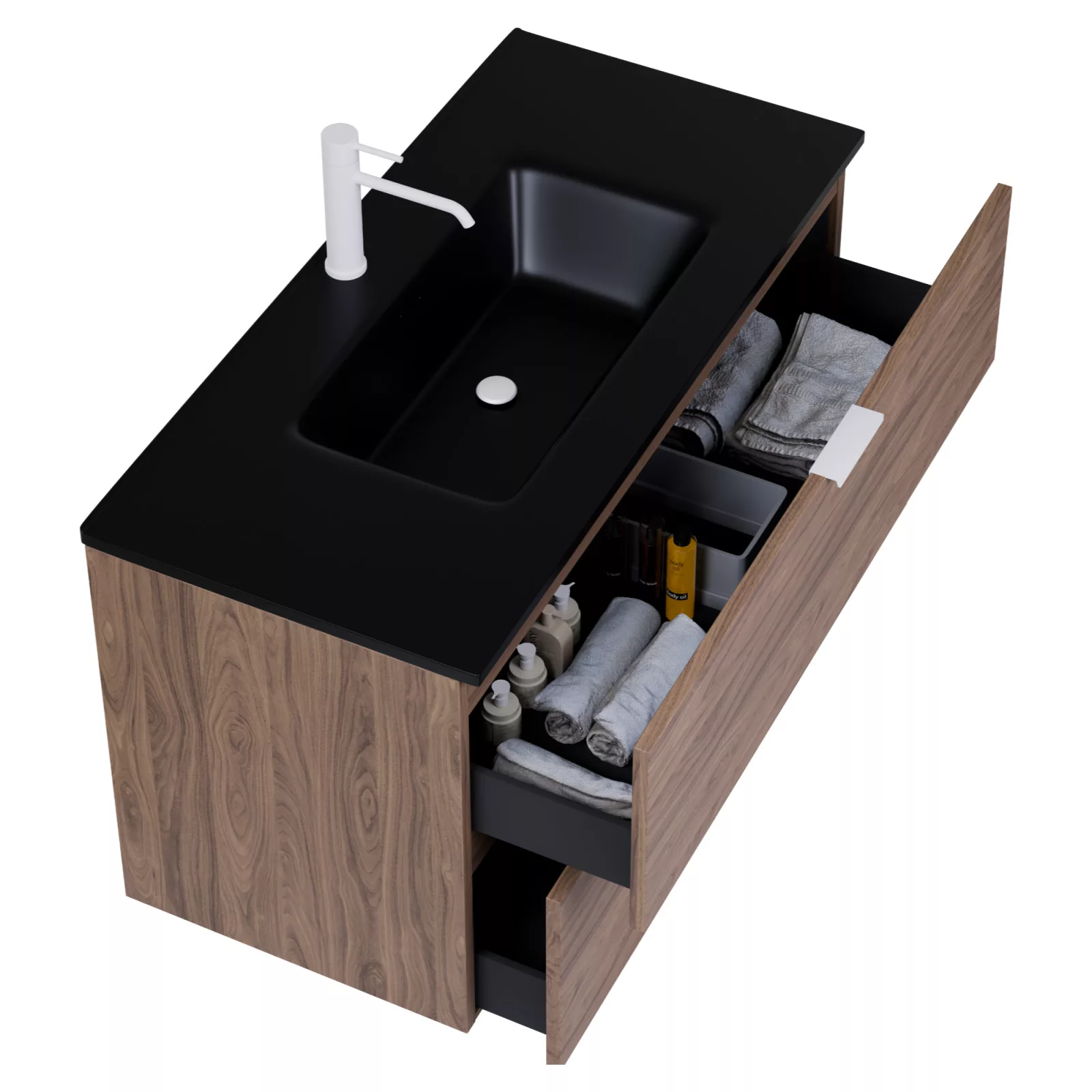 Napjainkban a praktikum mellett a fürdőszoba esztétikus megjelenése is fontos szempont. A függesztett bútorok egyre elterjedtebbé válnak, mivel számos előnnyel rendelkeznek, ide sorolható a modern, könnyed megjelenés és az egyszerű tisztítás. A függesztett fürdőszobai bútorok a klasszikus és modernebb stílusú fürdőszobákban is megállják a helyüket egyaránt. Nagyfokú rugalmasság jellemzi őket, mivel szinte bárhol elhelyezhetők a fürdőszobán belül. További előnyük, hogy soft close (csillapítós) zsanérral felszereltek, így  becsukáskor az ajtó vagy fiók finoman záródik be, csökkentve a terhelést és növelve az élettartamot. A szekrény fehér és matt fekete mosdóval, illetve mosdópulttal is szabadon kombinálható ízlés szerint. A teljesség érdekében a mosdószekrényekhez illő LED okostükröt és magas szekrényt is választhatunk, hogy a fürdőszobában lévő bútorok egy szemet gyönyörködtető egységet alkossanak.