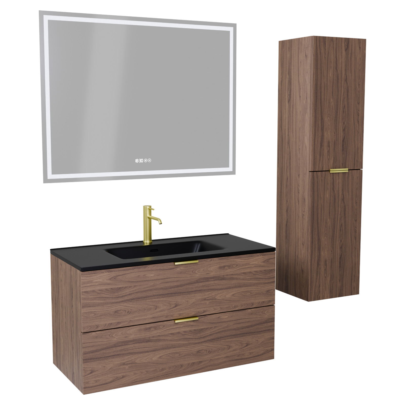 Szett tartalma: Mosdószekrény mosdóval, okos tükör, magasszekrény