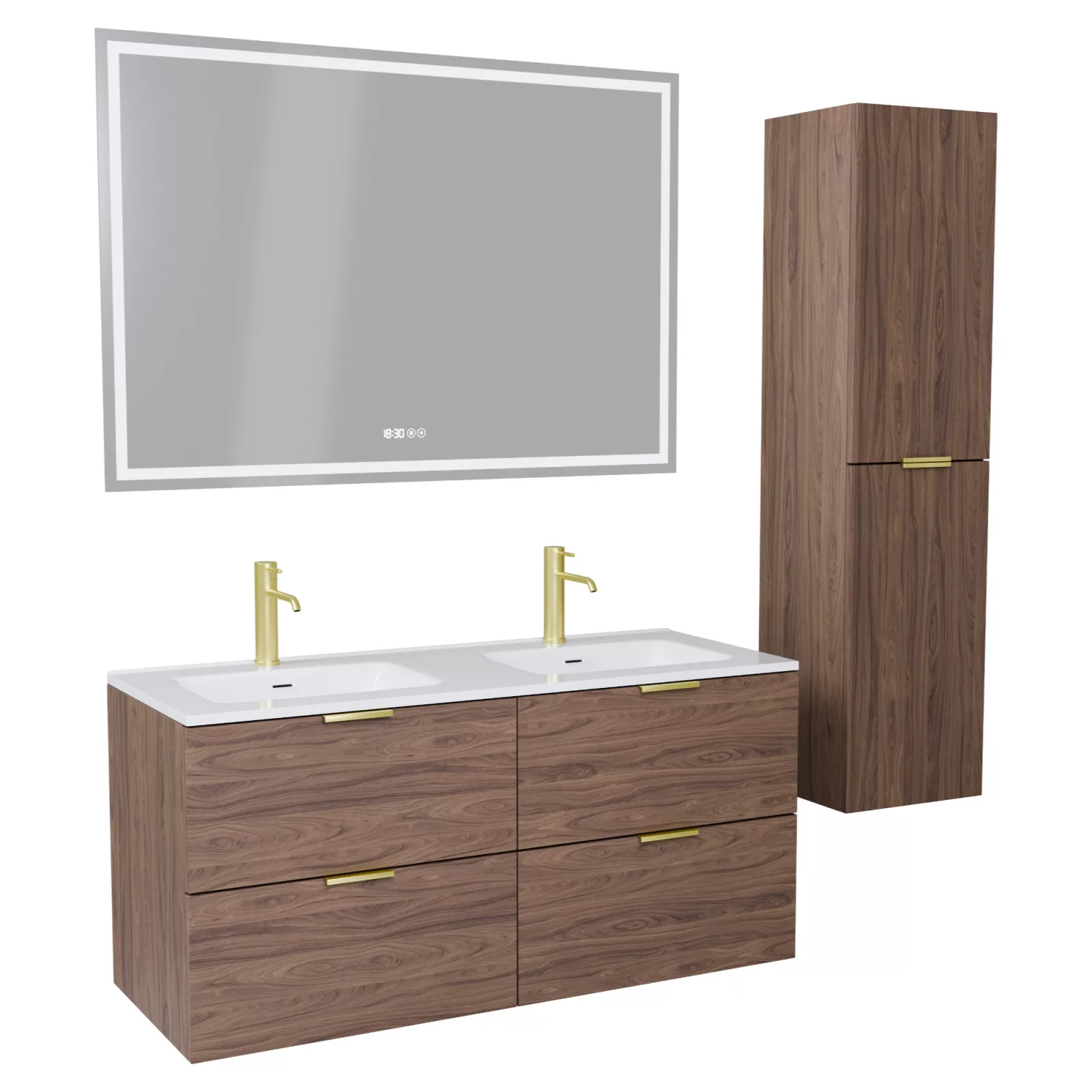 Saját márkás 120 cm széles komplett fürdőszoba bútor fali mosdószekrénnyel tölgyfa színben, szálcsiszolt arany fogantyúkkal, okos LED tükörrel és magasszekrénnyel.
