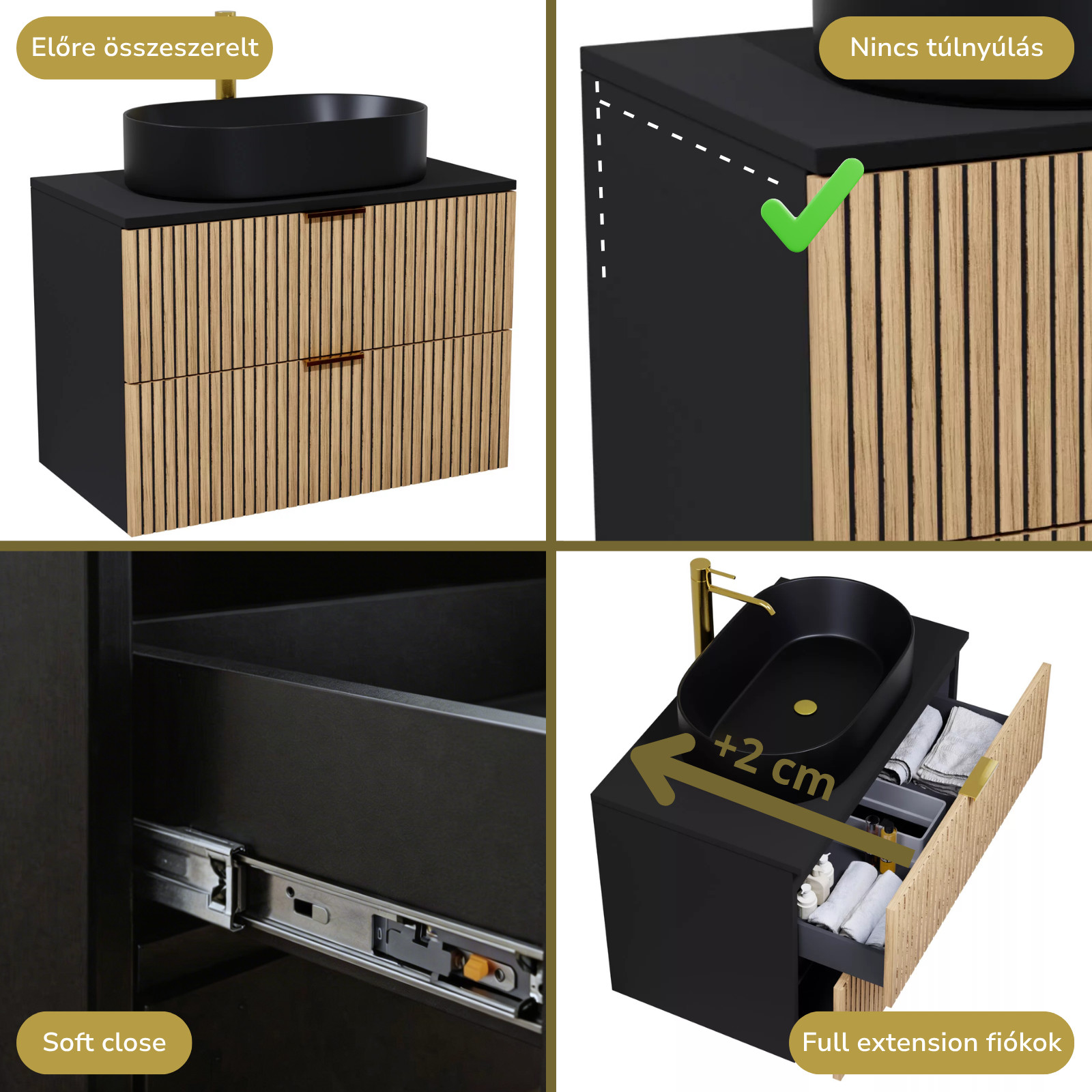 matt fekete mosdószekrény, teljes kihúzhatóságú fiókokkal