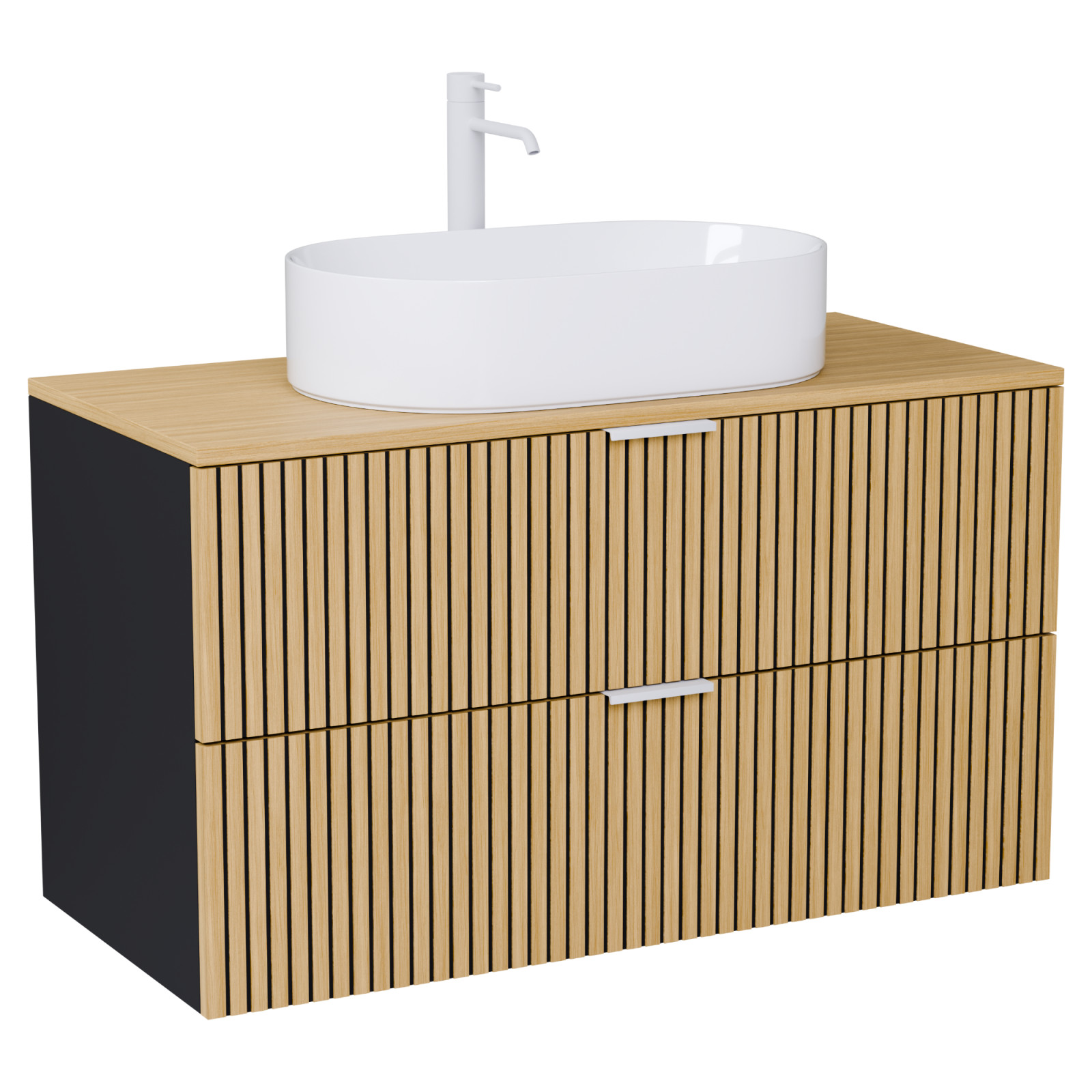 Saját márkás 100 cm széles komplett fürdőszoba bútor fali mosdószekrénnyel matt fekete színben, bordázott hikoridió színű fiók fronttal, matt fehér fogantyúkkal, hikoridió színű mosdópulttal és fali okos LED tükörrel.
