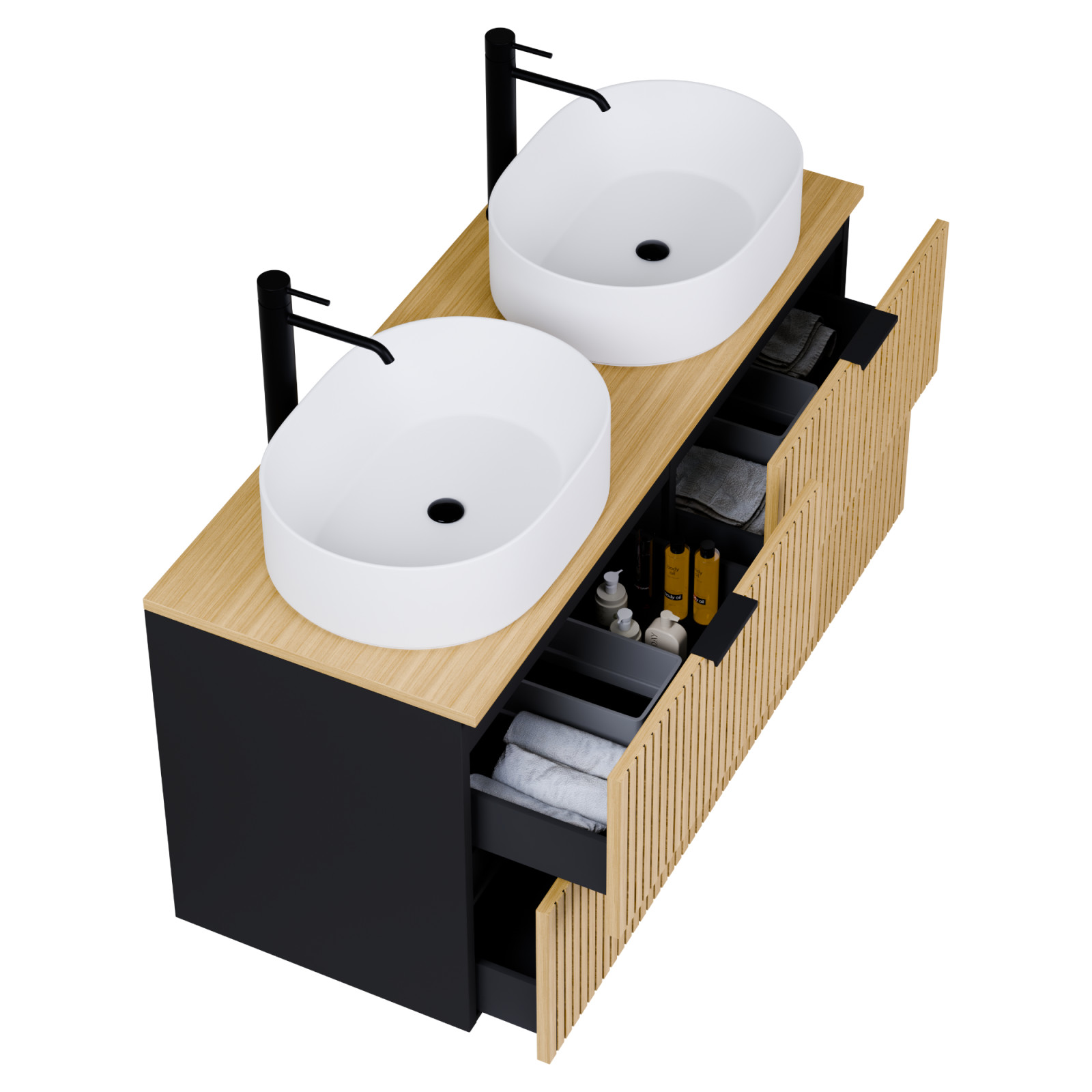 matt fekete mosdószekrény, teljes kihúzhatóságú fiókokkal