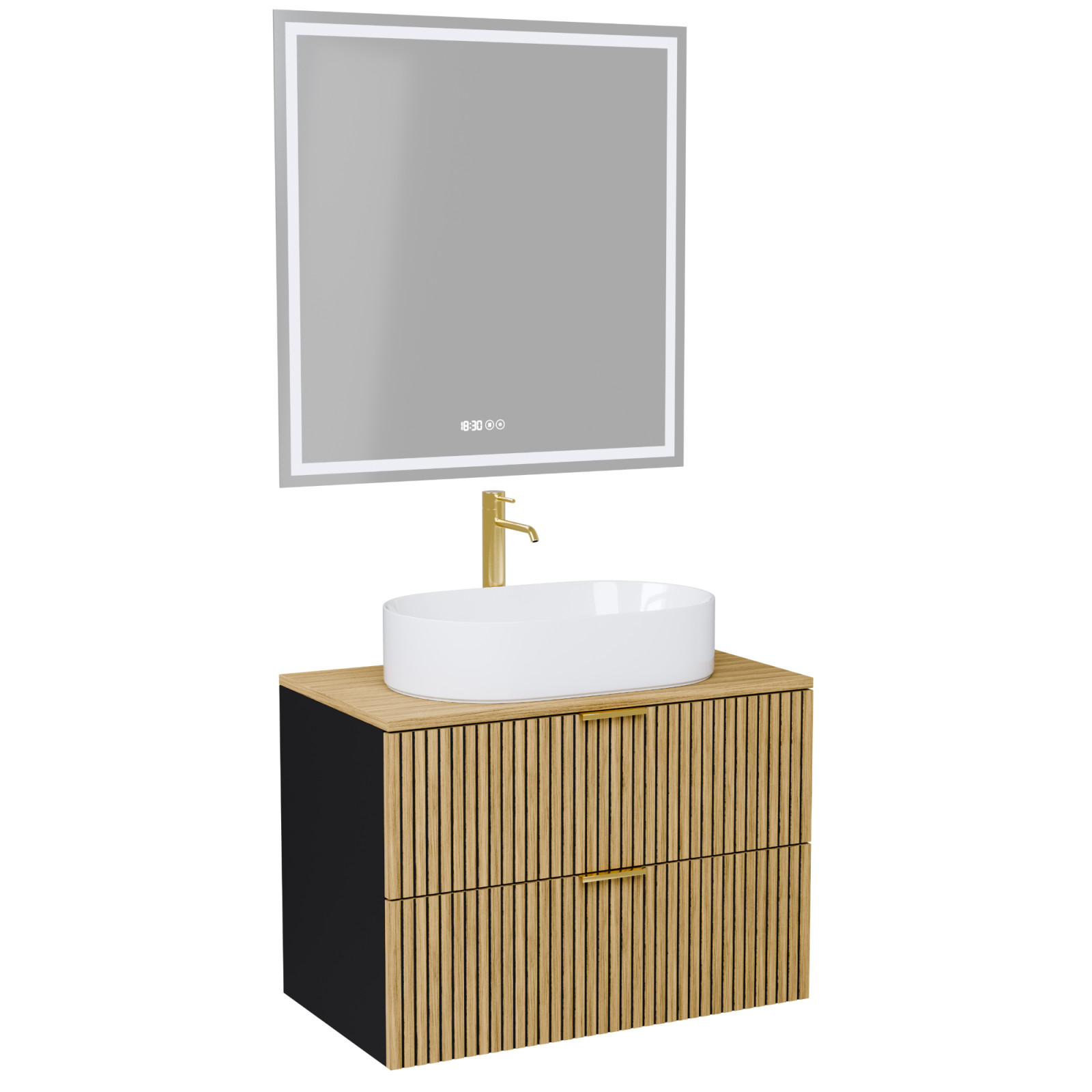 Saját márkás 60 cm széles komplett fürdőszoba bútor fali mosdószekrénnyel matt fekete színben, bordázott hikoridió színű fiók fronttal, szálcsiszolt arany fogantyúkkal, hikoridió színű mosdópulttal és fali okos LED tükörrel.