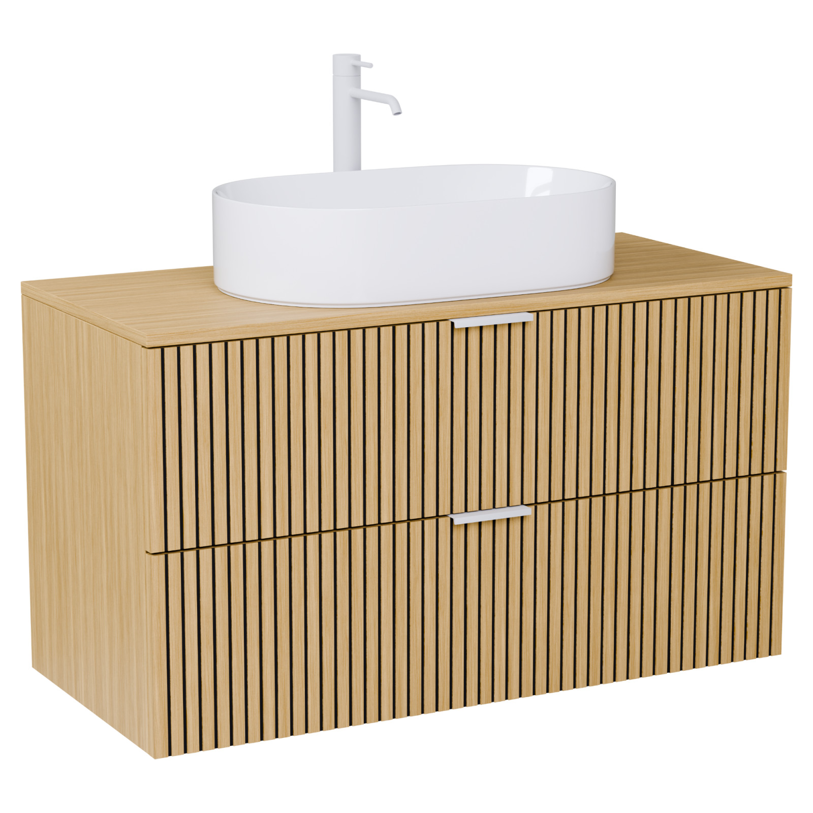 Saját márkás 100 cm széles komplett fürdőszoba bútor fali mosdószekrénnyel hikoridió színben, bordázott hikoridió színű fiók fronttal, matt fehér fogantyúkkal, hikoridió színű mosdópulttal és fali okos LED tükörrel.