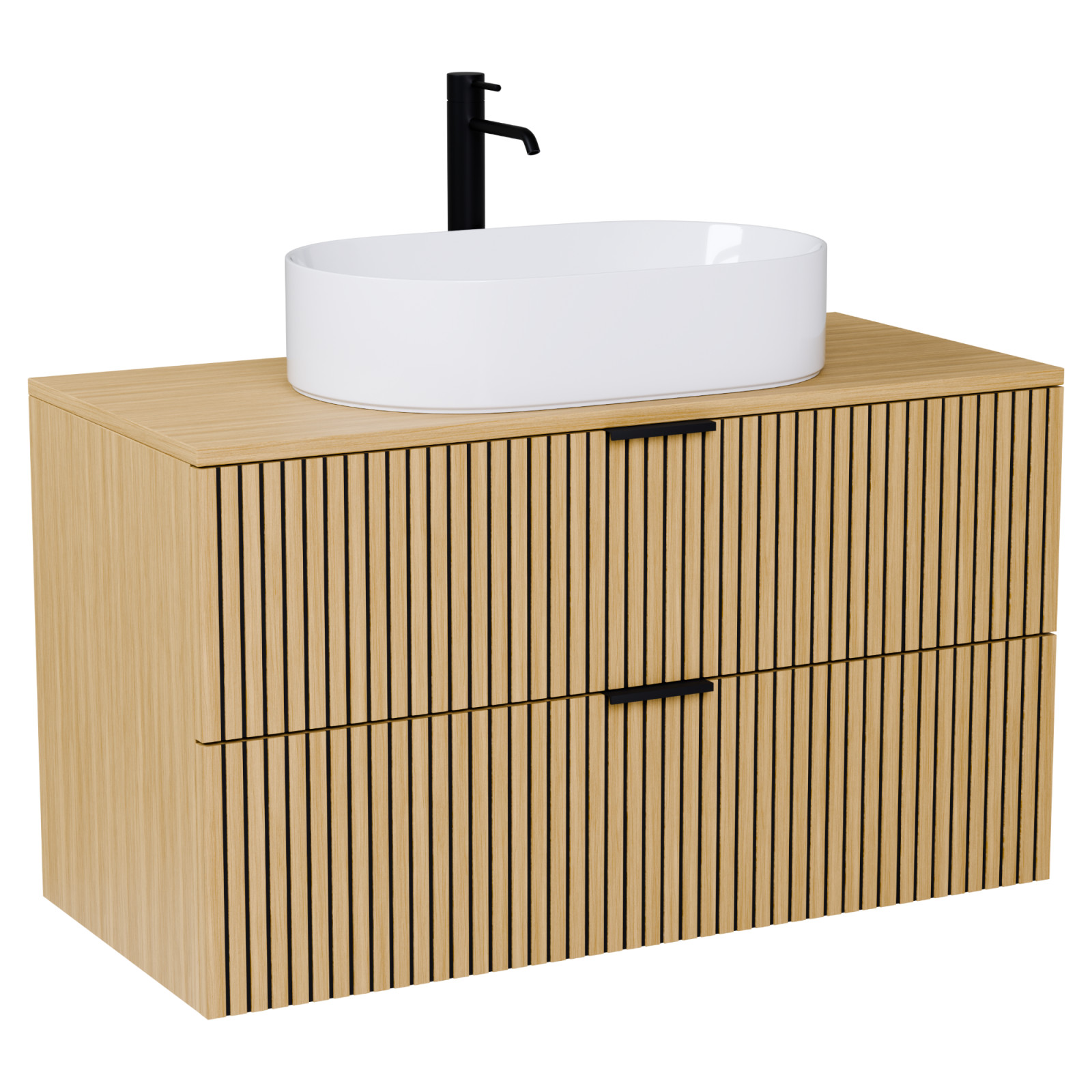 Saját márkás 100 cm széles komplett fürdőszoba bútor fali mosdószekrénnyel hikoridió színben, bordázott hikoridió színű fiók fronttal, matt fekete fogantyúkkal, hikoridió színű mosdópulttal és fali okos LED tükörrel.
