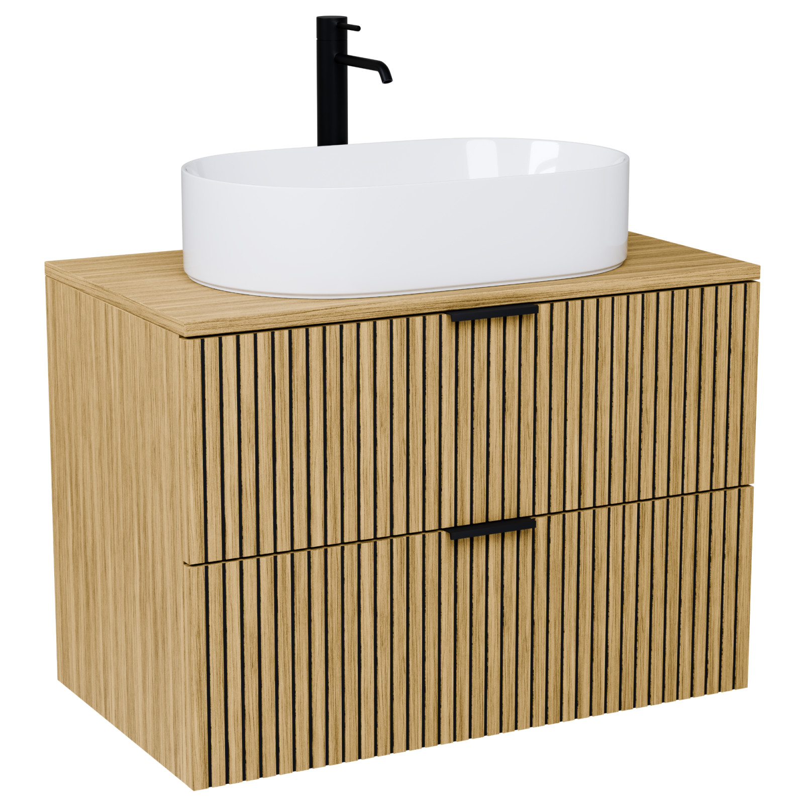Saját márkás 60 cm széles fali mosdószekrény hikoridió színben, bordázott hikoridió színű fiók fronttal, matt fekete fogantyúkkal, hikoridió színű mosdópulttal, rejtett fióksínnel és önbehúzos technológiával ellátott.