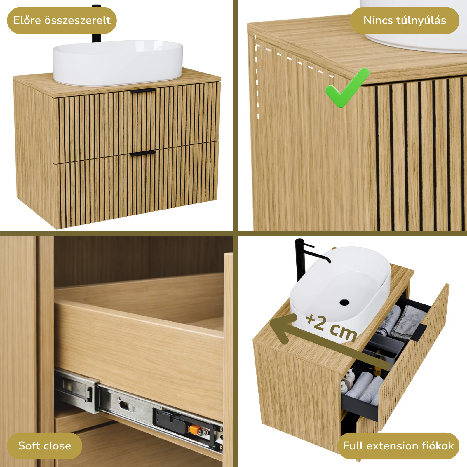 A bútort összeszerelve szállítjuk ki, így Önnek csak a mosdót és a fiók frontot kell ráhelyeznie!