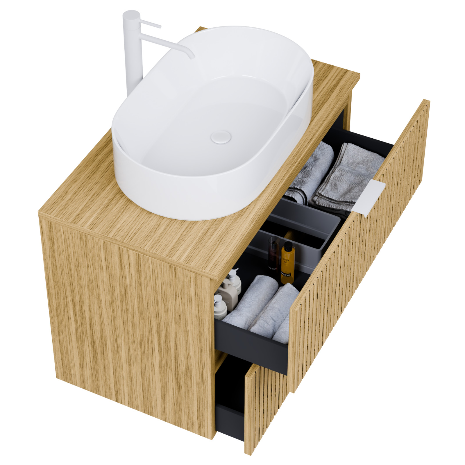Saját márkás 60 cm széles komplett fürdőszoba bútor fali mosdószekrénnyel hikoridió színben, bordázott hikoridió színű fiók fronttal, matt fehér fogantyúkkal, hikoridió színű mosdópulttal és fali okos LED tükörrel.