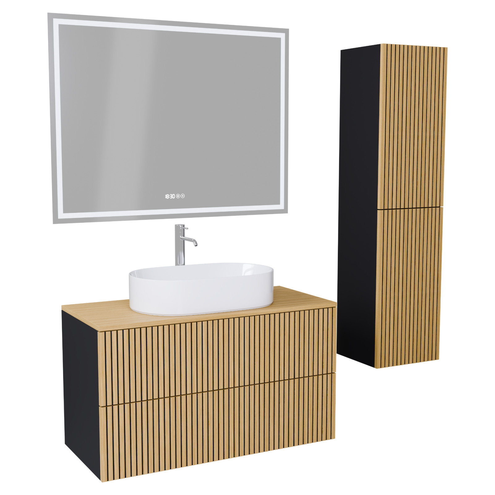 Napjainkban a praktikum mellett a fürdőszoba esztétikus megjelenése is fontos szempont. A függesztett bútorok egyre elterjedtebbé válnak, mivel számos előnnyel rendelkeznek, ide sorolható a modern, könnyed megjelenés és az egyszerű tisztítás . A függesztett fürdőszobai bútorok a klasszikus és modernebb stílusú fürdőszobákban is megállják a helyüket egyaránt. Nagyfokú rugalmasság jellemzi őket, mivel szinte bárhol elhelyezhetők a fürdőszobán belül. További előnyük, hogy soft close (csillapítós) zsanérral felszereltek, így becsukáskor az ajtó vagy fiók finoman záródik be, csökkentve a terhelést és növelve az élettartamot . A szekrény fehér és matt fekete mosdóval, illetve mosdópulttal is szabadon kombinálható ízlés szerint. A teljesség érdekében a mosdószekrényekhez illő LED okostükröt és magasszekrényt is választhatunk, hogy a fürdőszobában lévő bútorok egy szemet gyönyörködtető egységet alkossanak.