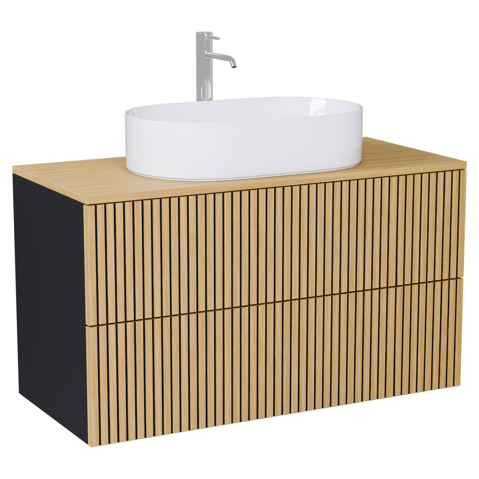 matt fekete mosdószekrény, teljes kihúzhatóságú fiókokkal