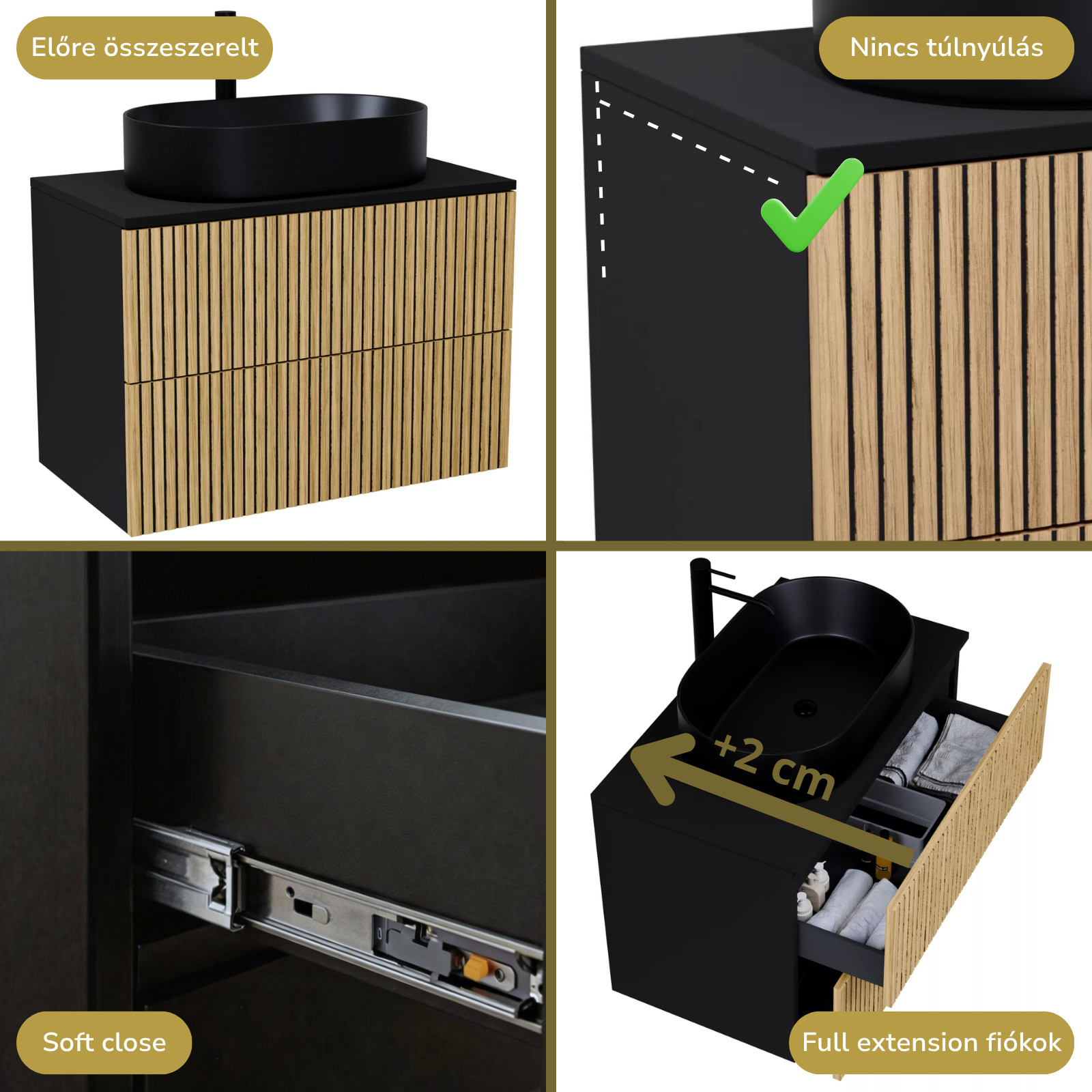 matt fekete mosdószekrény, teljes kihúzhatóságú fiókokkal