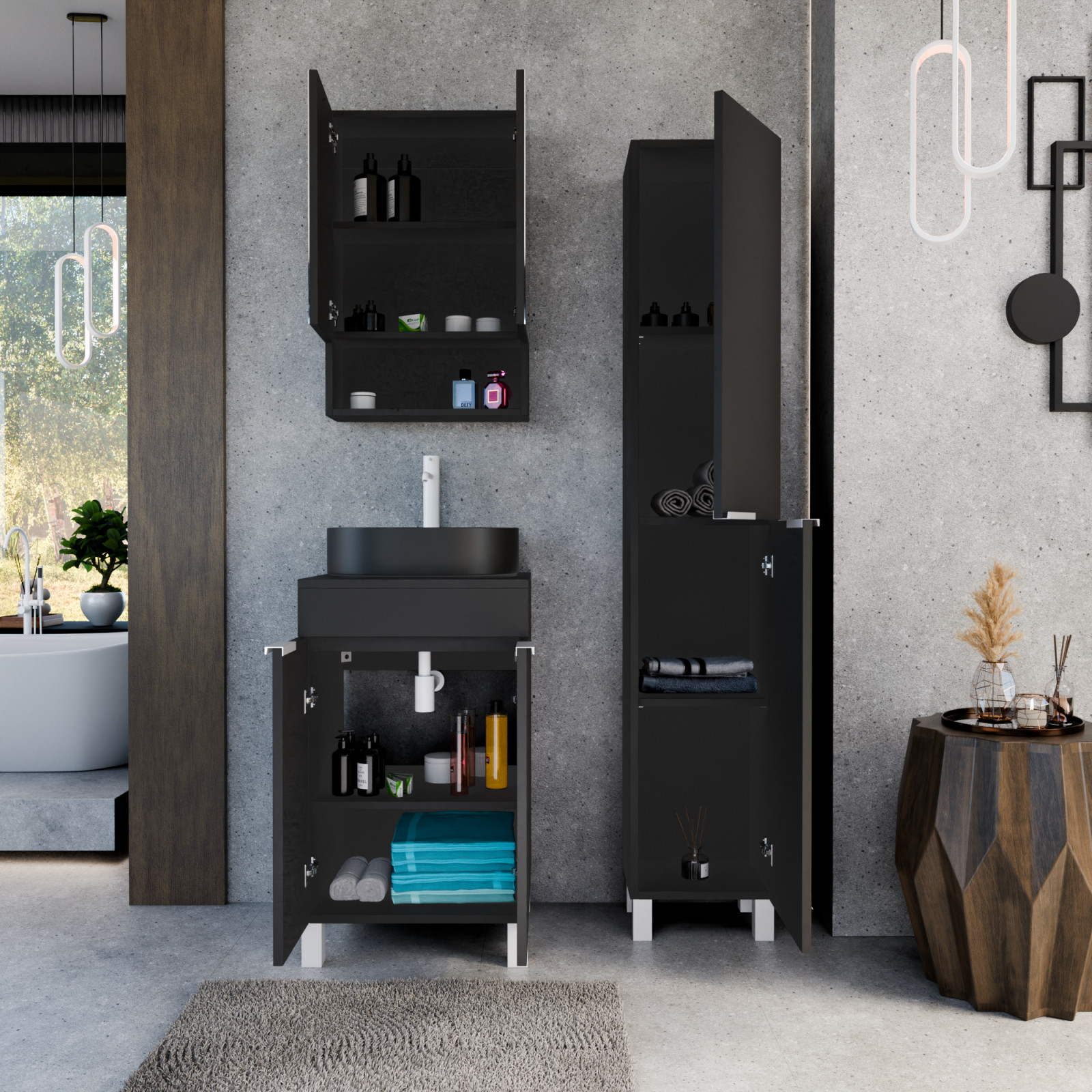 Napjainkban a praktikum mellett a fürdőszoba esztétikus megjelenése is fontos szempont. A lábon álló bútorok egyre elterjedtebbé válnak, mivel számos előnnyel rendelkeznek, ide sorolható a modern, könnyed megjelenés és az egyszerű tisztítás. A lábon álló fürdőszobai bútorok a klasszikus és modernebb stílusú fürdőszobákban is megállják a helyüket egyaránt. Nagyfokú rugalmasság jellemzi őket, mivel szinte bárhol elhelyezhetők a fürdőszobán belül. További előnyük, hogy soft close (csillapítós) zsanérral felszereltek, így  becsukáskor az ajtó vagy fiók finoman záródik be, csökkentve a terhelést és növelve az élettartamot. A szekrény fehér és matt fekete mosdóval, illetve mosdópulttal is szabadon kombinálható ízlés szerint. A teljesség érdekében a mosdószekrényekhez illő tükrös szekrényt és magas szekrényt is választhatunk, hogy a fürdőszobában lévő bútorok egy szemet gyönyörködtető egységet alkossanak.