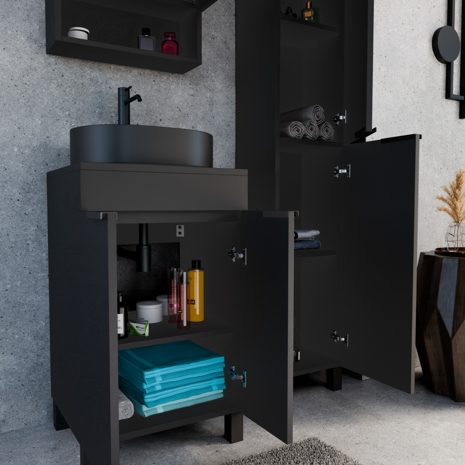 • matt fekete mosdószekrény, kivehető polccal