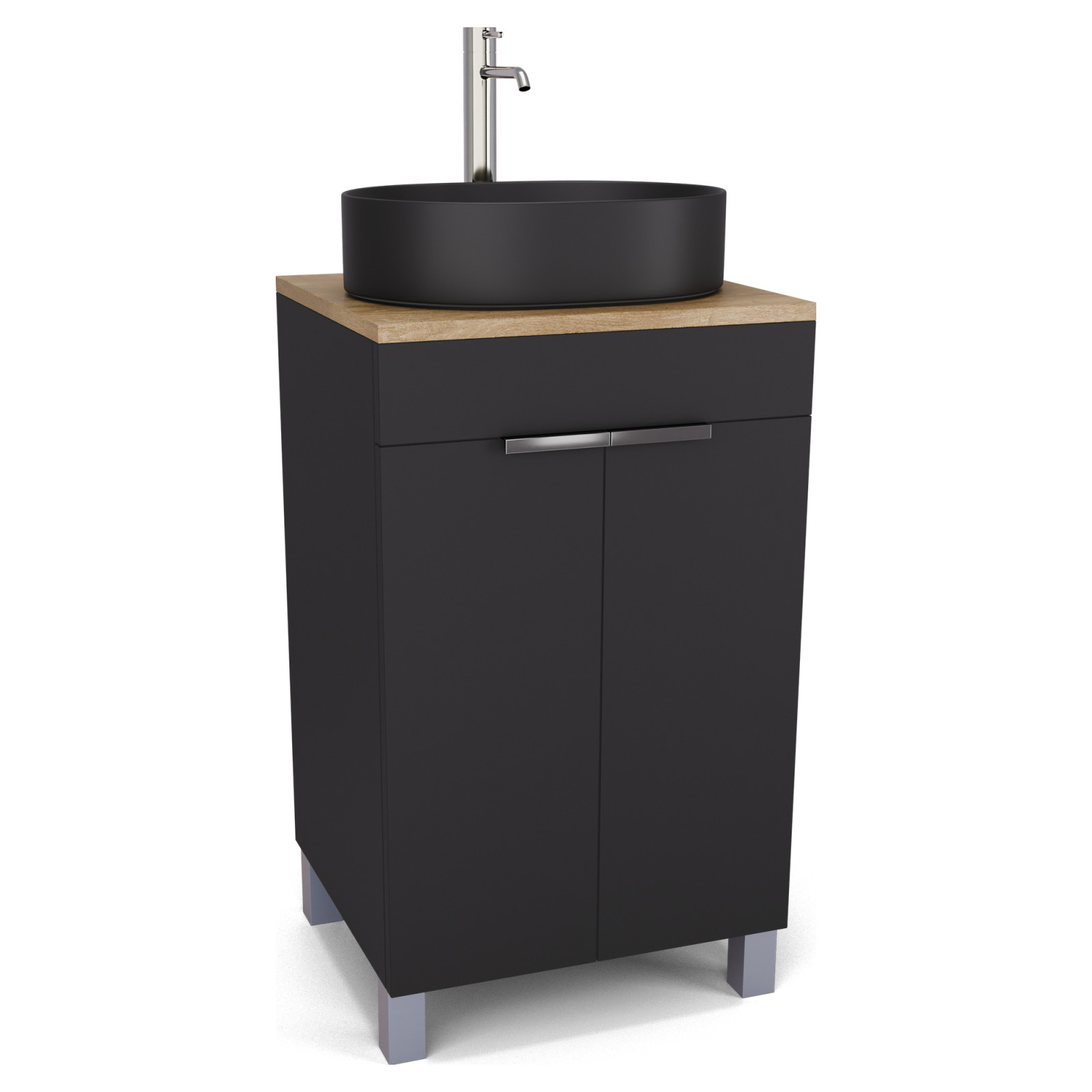 Saját márkás 50 cm széles álló mosdószekrény matt fekete színben, fényes króm fogantyúkkal és lábakkal, tölgyfa színű mosdópulttal, soft-close zsanérokkal ellátva.