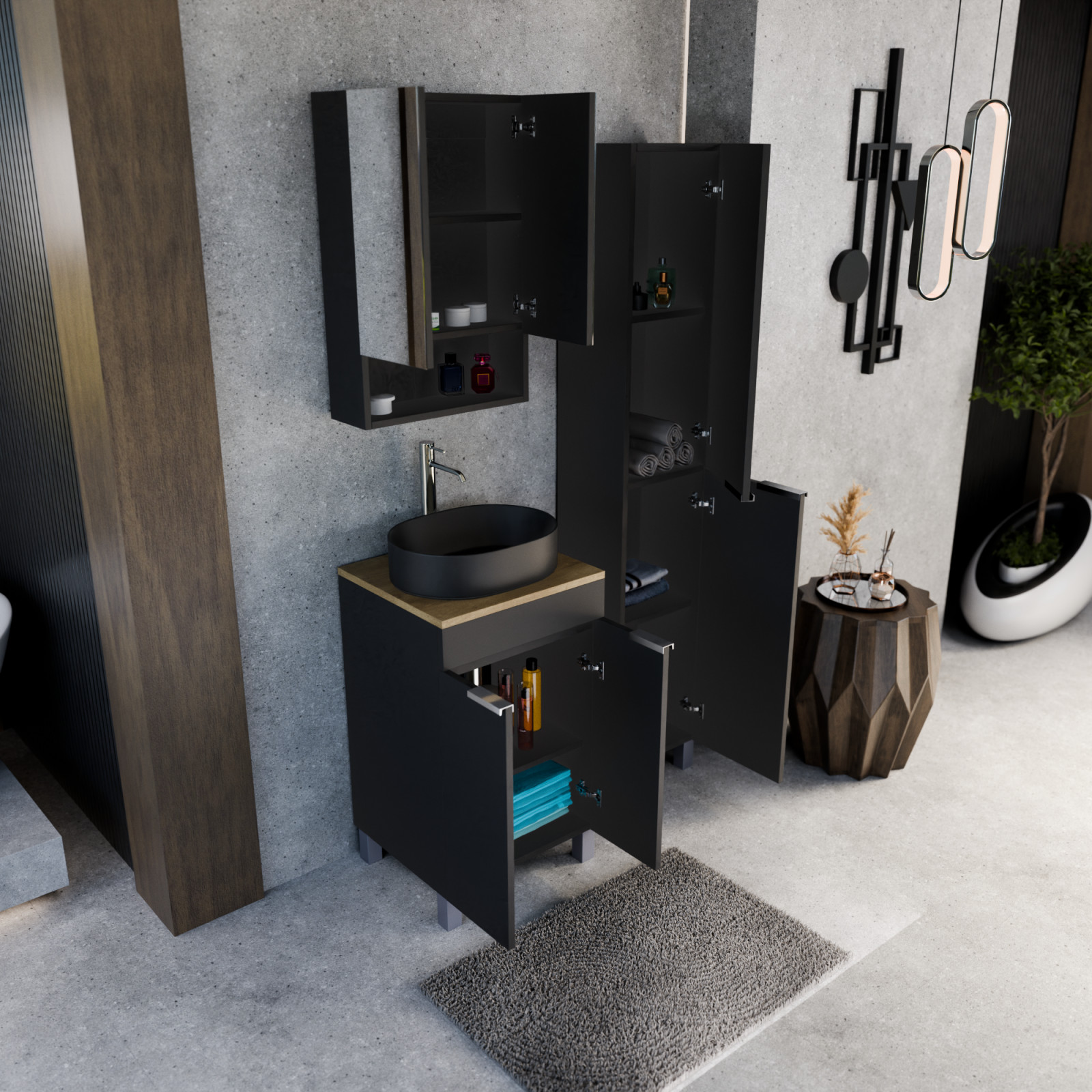 • matt fekete mosdószekrény, kivehető polccal