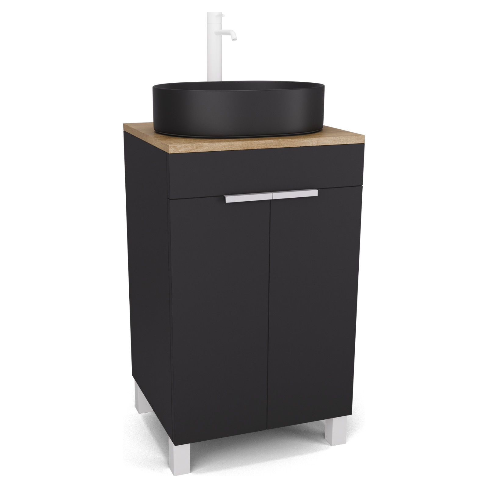 Saját márkás 50 cm széles álló mosdószekrény matt fekete színben, matt fehér fogantyúkkal és lábakkal, tölgyfa színű mosdópulttal, soft-close zsanérokkal ellátva.