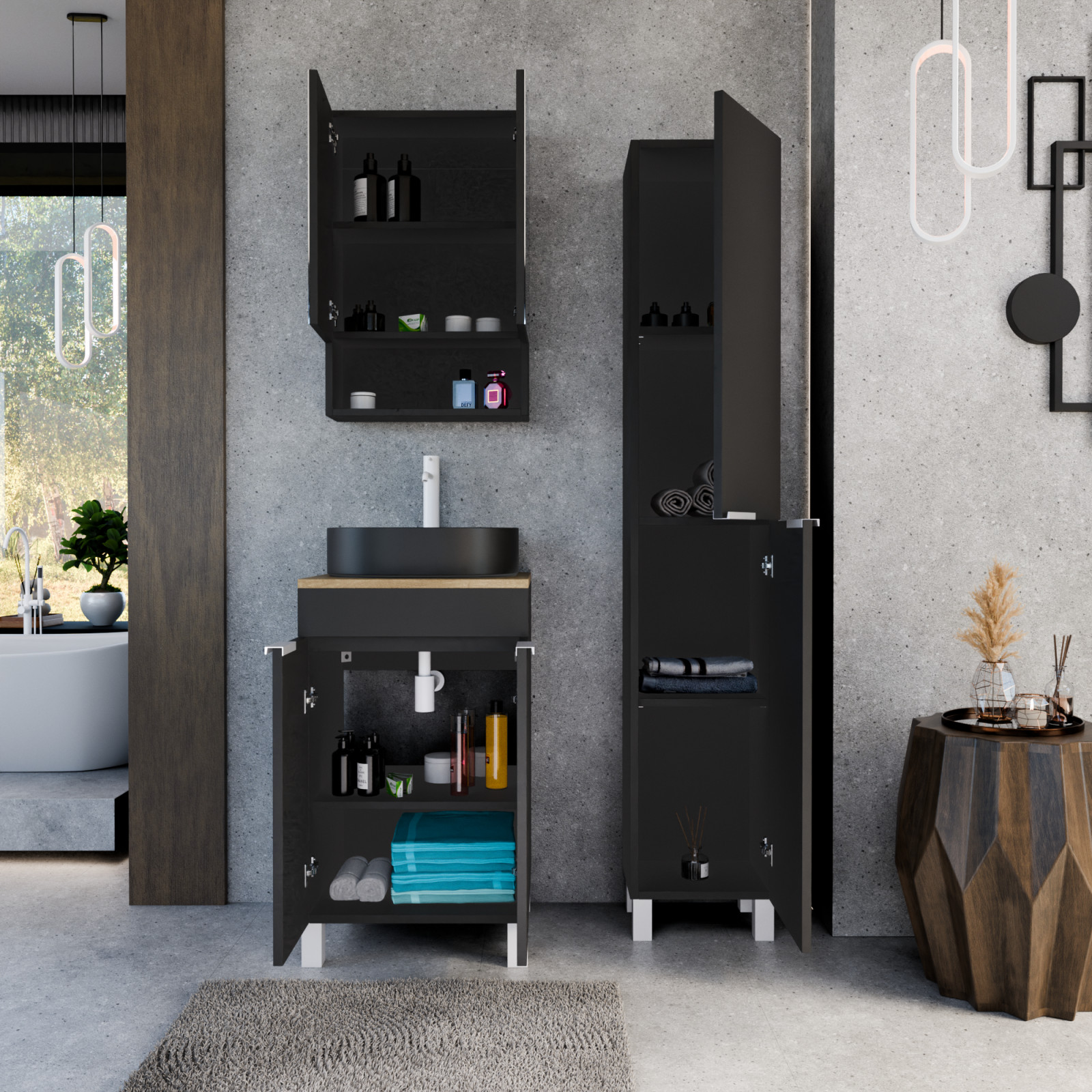 • matt fekete mosdószekrény, kivehető polccal