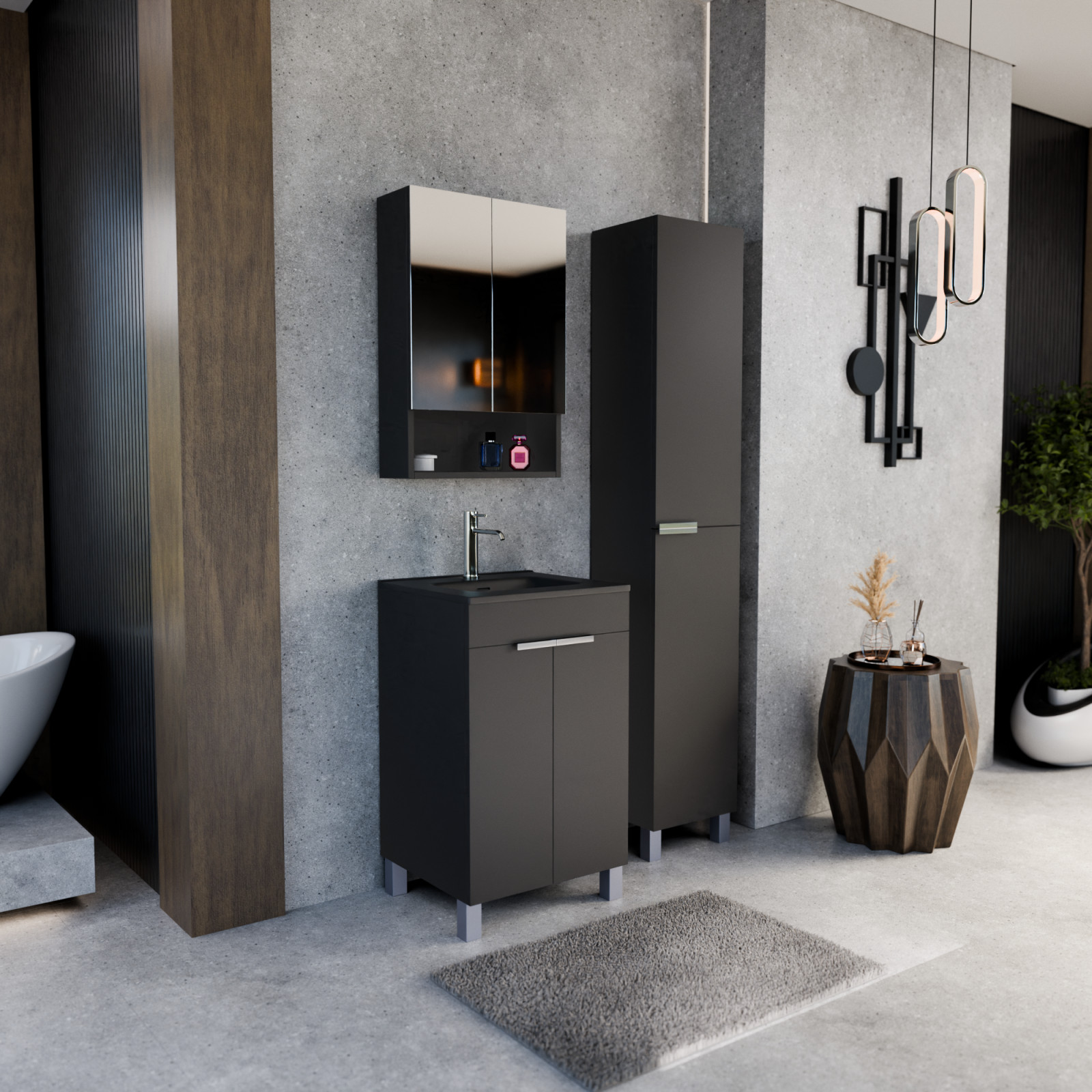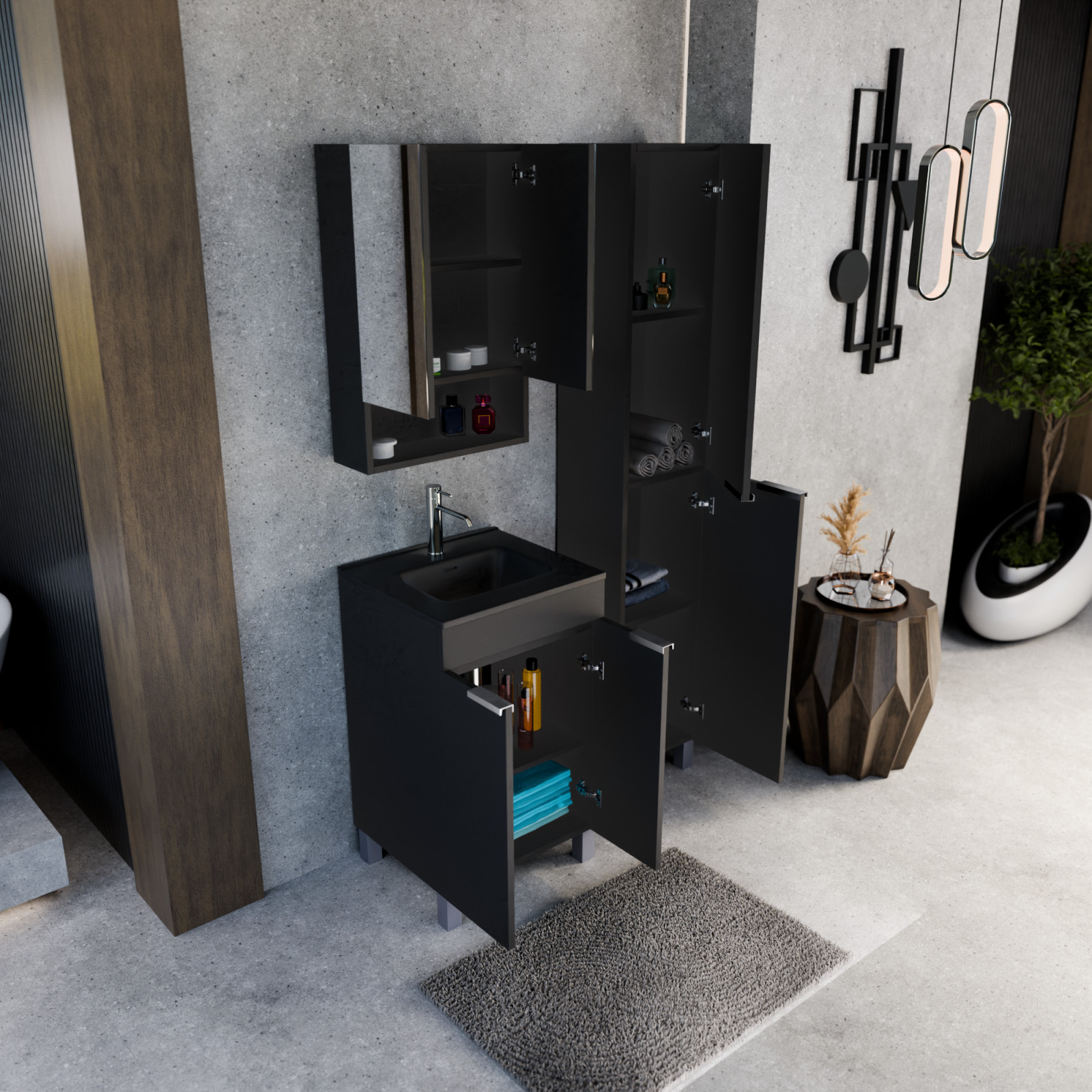 HD Paris Matt Black 50 komplett fürdőszoba bútor álló mosdószekrénnyel, fényes króm elemekkel, matt fekete slim mosdóval és tükrös szekrénnyel