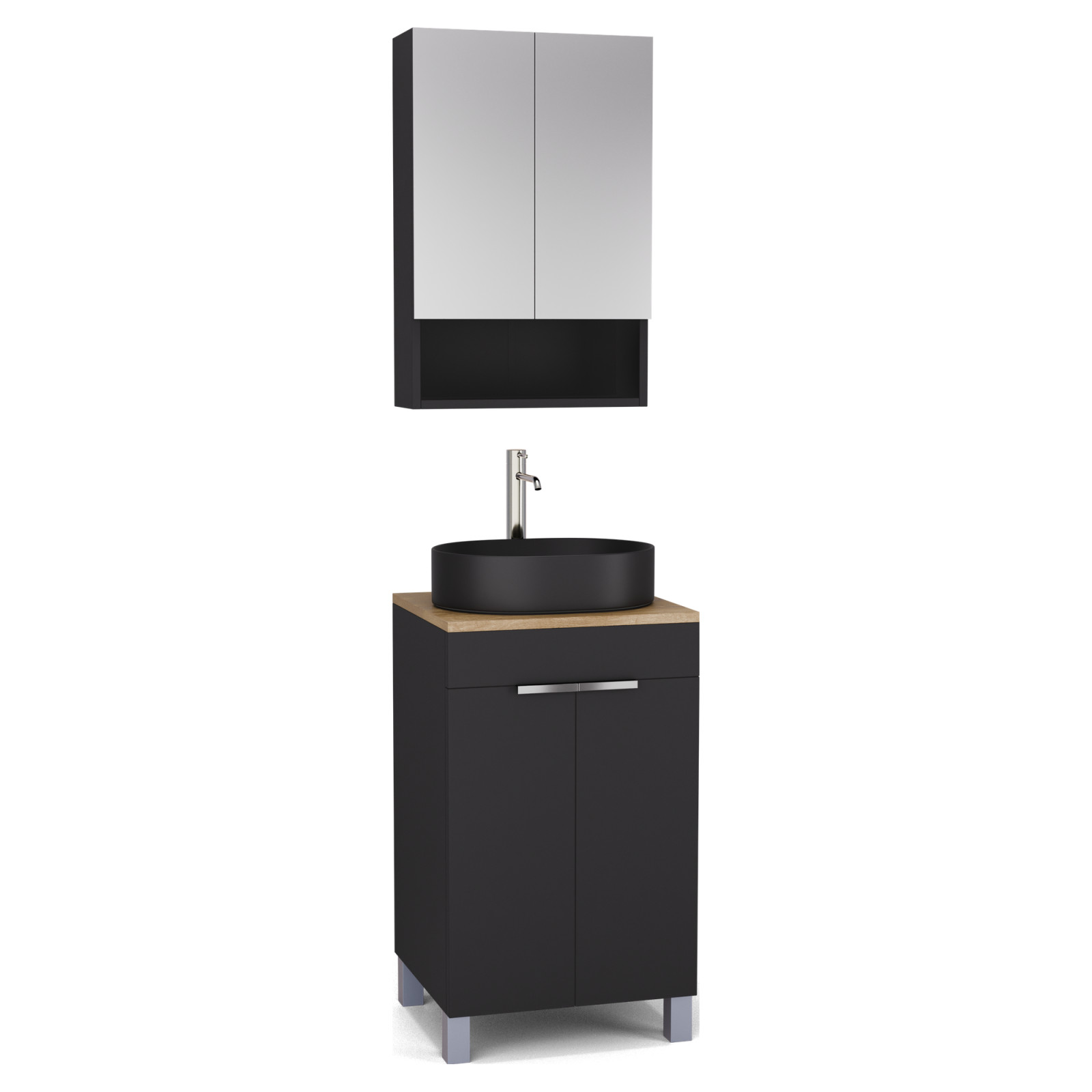 HD Paris Matt Black 50 komplett fürdőszoba bútor álló mosdószekrénnyel, fényes króm elemekkel, tölgyfa színű mosdópulttal és tükrös szekrénnyel