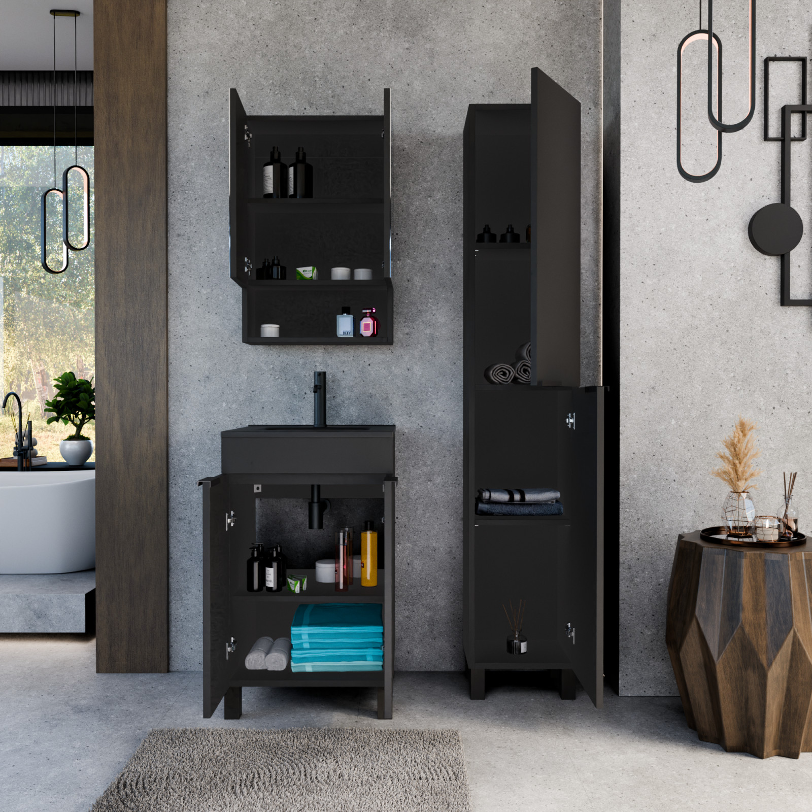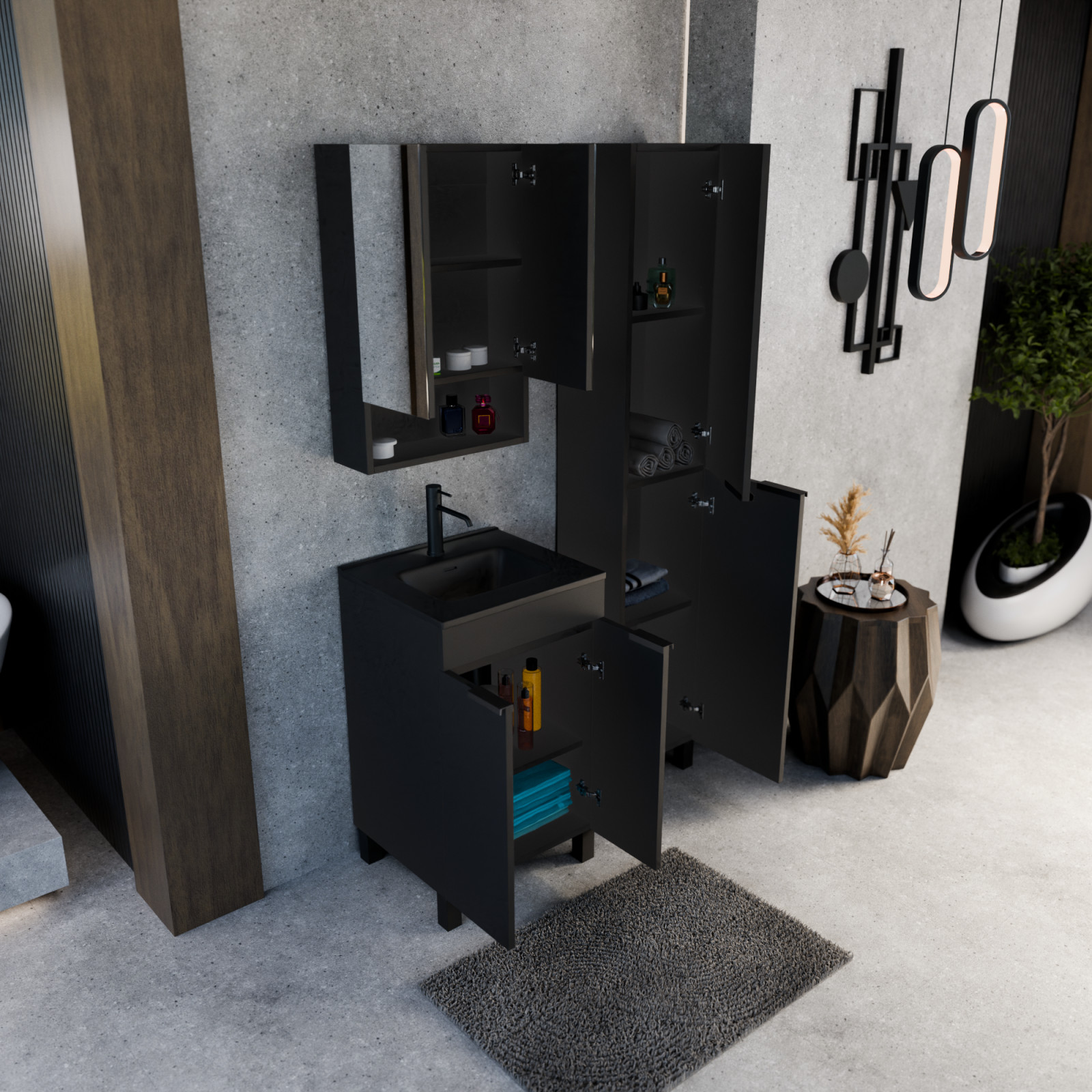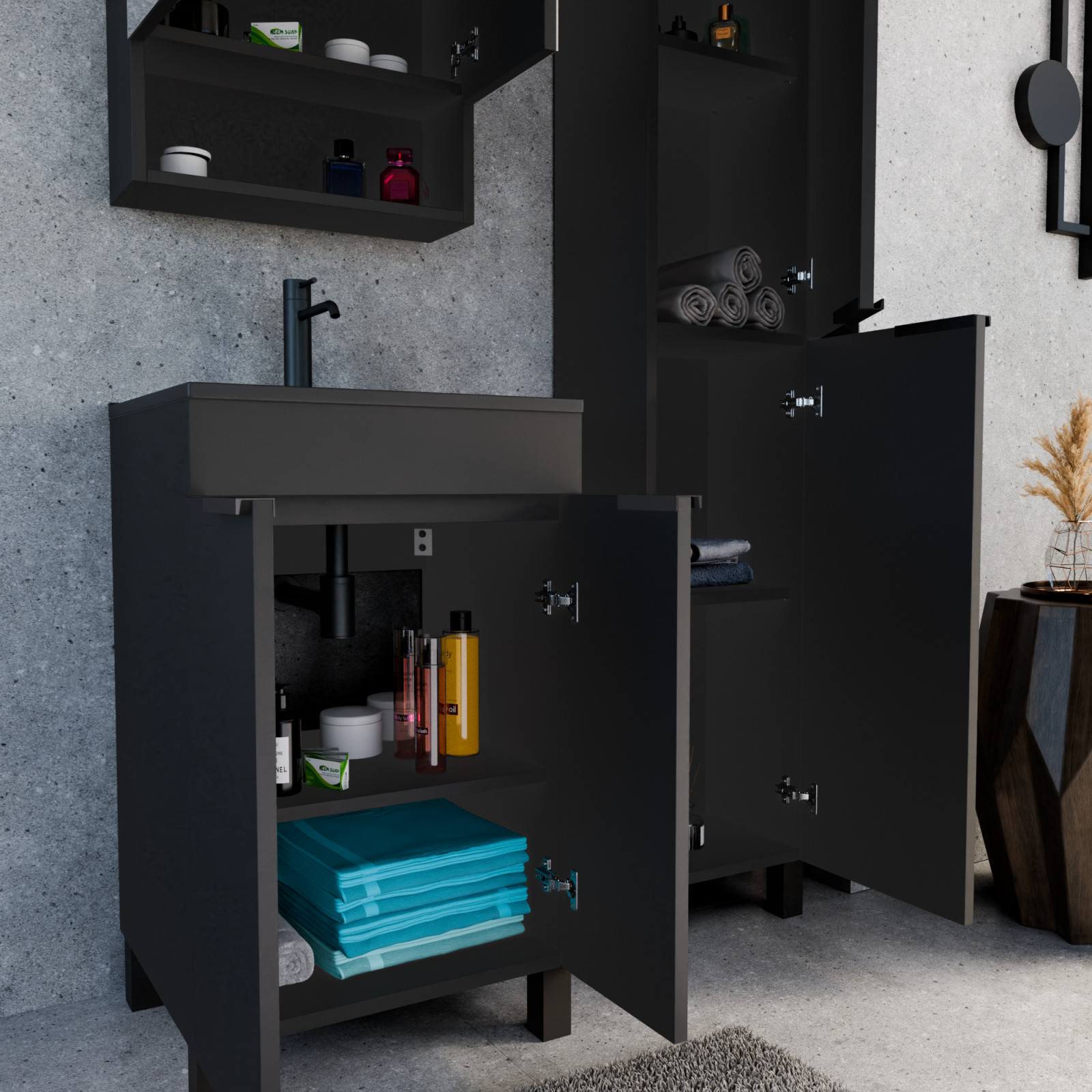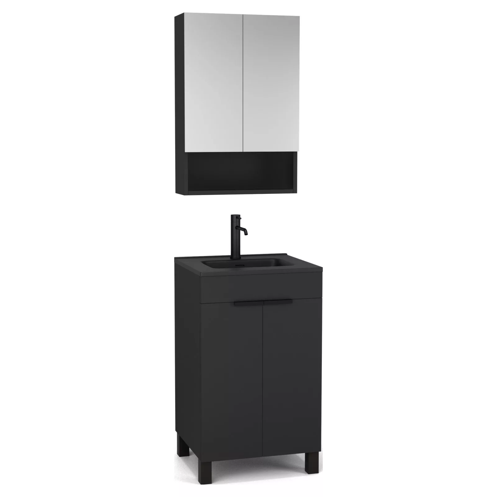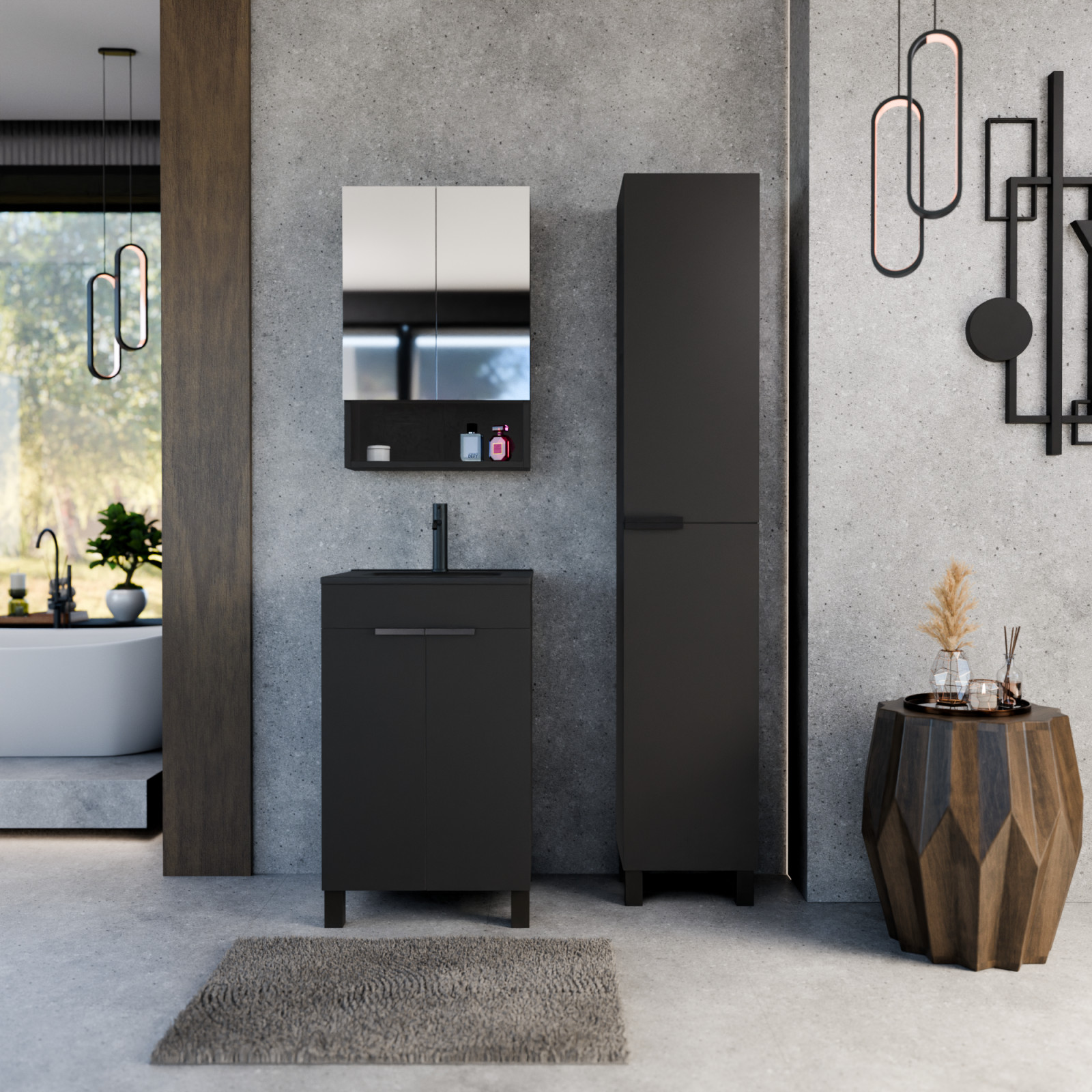 HD Paris Matt Black 50 komplett fürdőszoba bútor álló mosdószekrénnyel, matt fekete elemekkel, matt fekete slim mosdóval és tükrös szekrénnyel