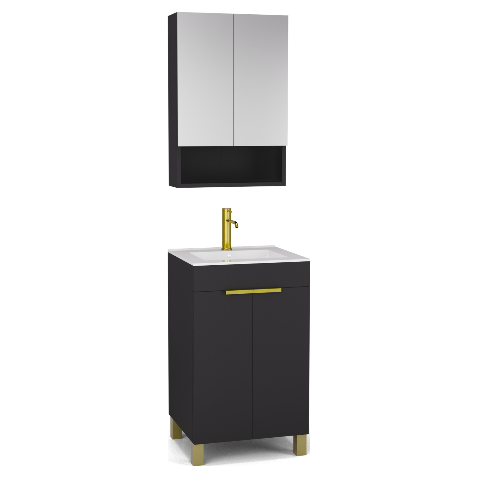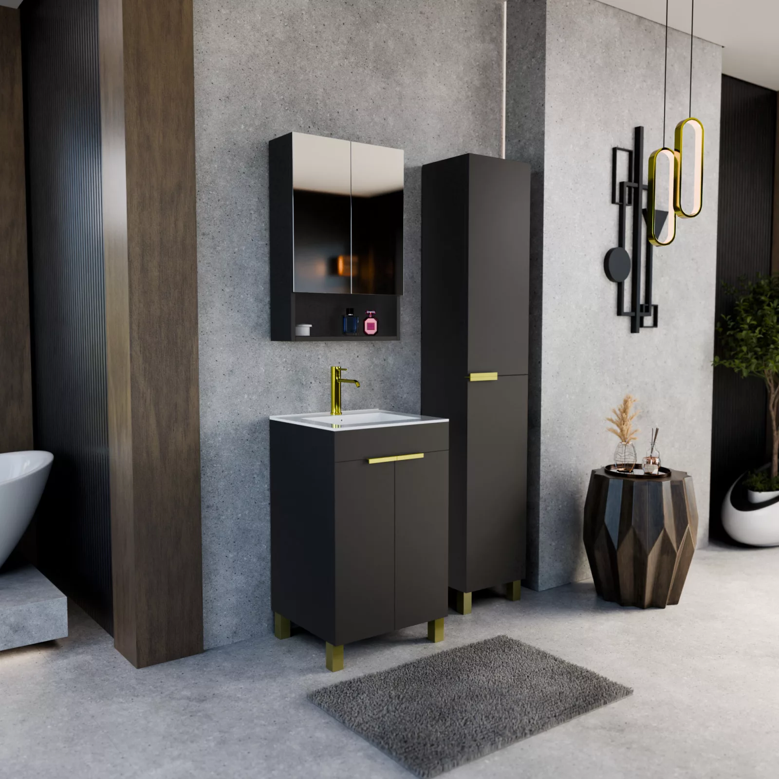 Saját márkás 50 cm széles komplett fürdőszoba bútor álló mosdószekrénnyel matt fekete színben, szálcsiszolt arany fogantyúkkal és lábakkal és fali tükrös szekrénnyel.
