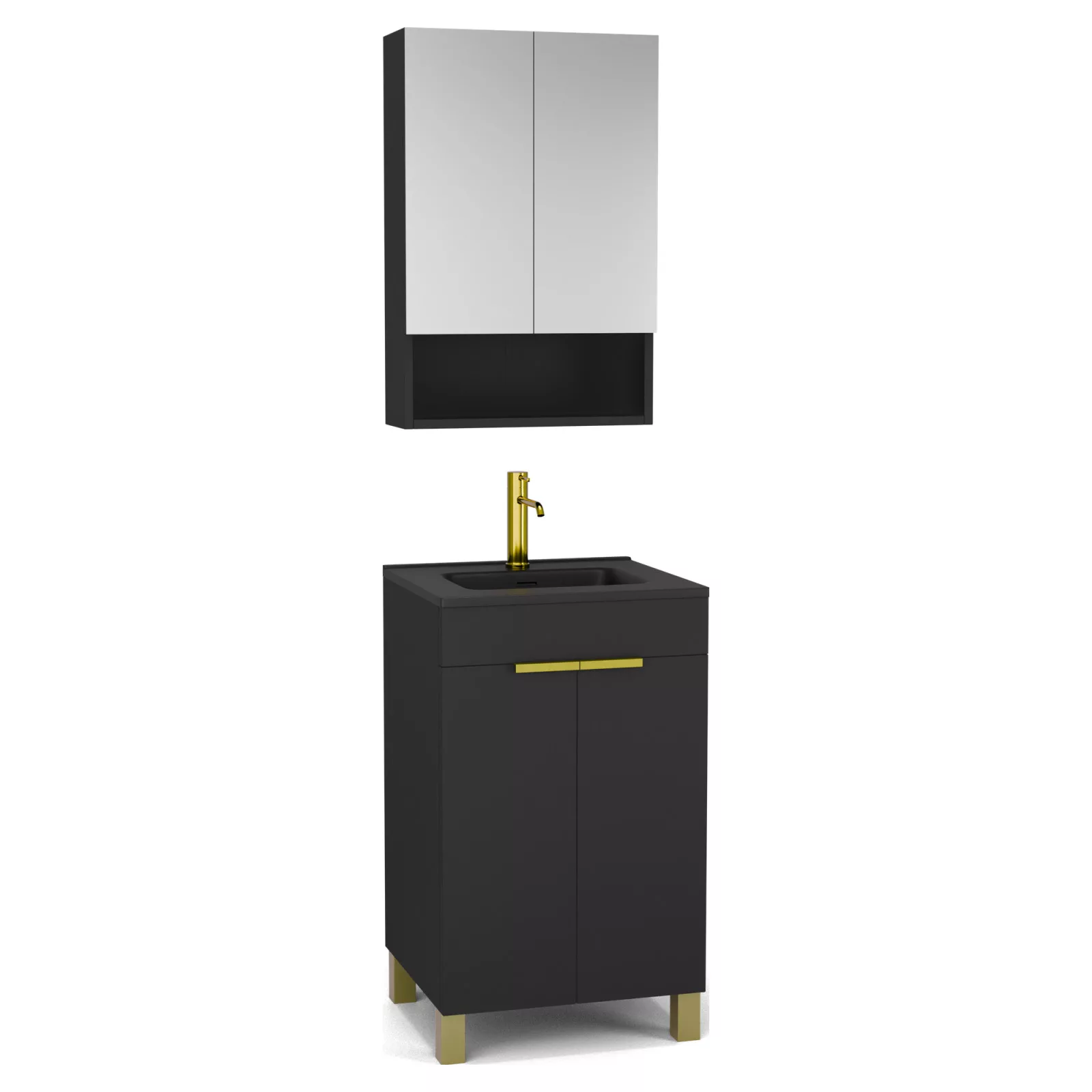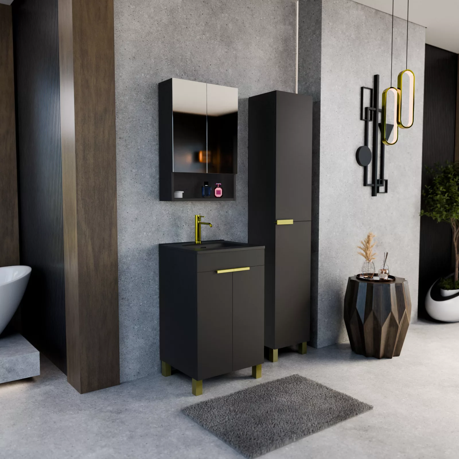 HD Paris Matt Black 50 komplett fürdőszoba bútor álló mosdószekrénnyel, szálcsiszolt arany elemekkel, matt fekete slim mosdóval és tükrös szekrénnyel