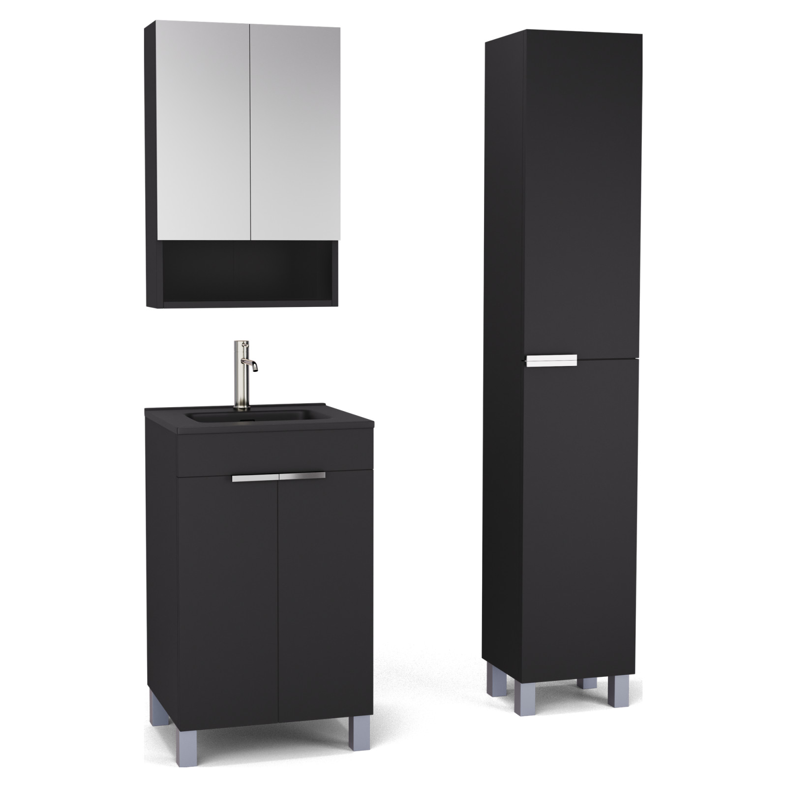Saját márkás 50 cm széles komplett fürdőszoba bútor álló mosdószekrénnyel matt fekete színben, fényes króm fogantyúkkal és lábakkal, tükrös szekrénnyel és magasszekrénnyel.