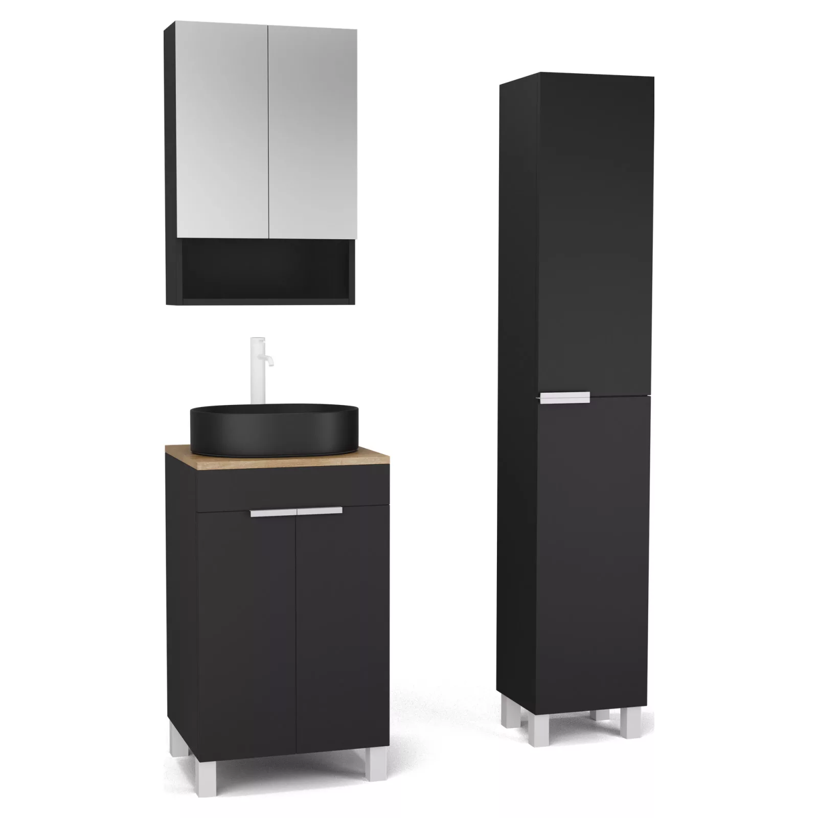 Saját márkás 50 cm széles komplett fürdőszoba bútor álló mosdószekrénnyel matt fekete színben, matt fehér fogantyúkkal és lábakkal, tölgyfa színű mosdópulttal, tükrös szekrénnyel és magasszekrénnyel.