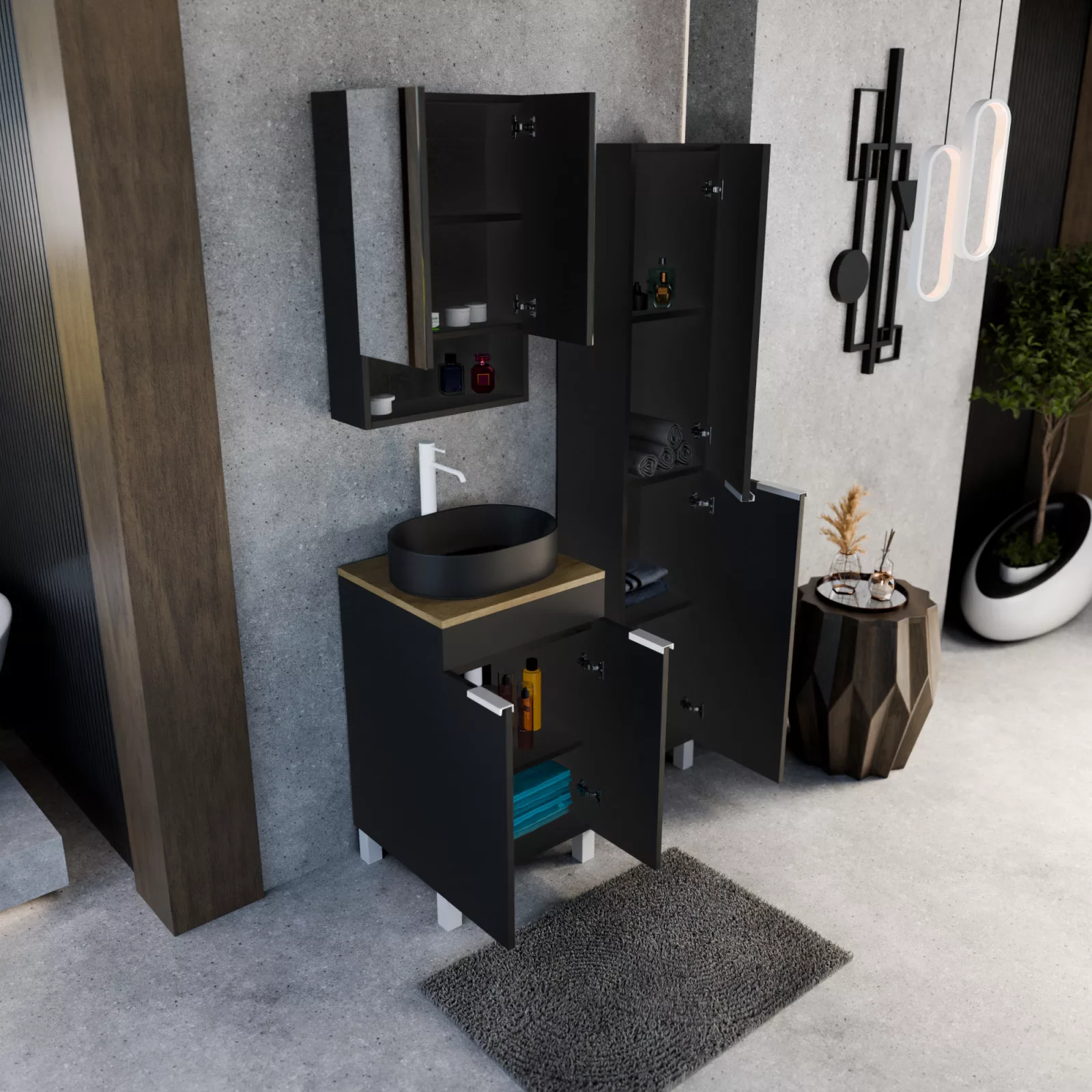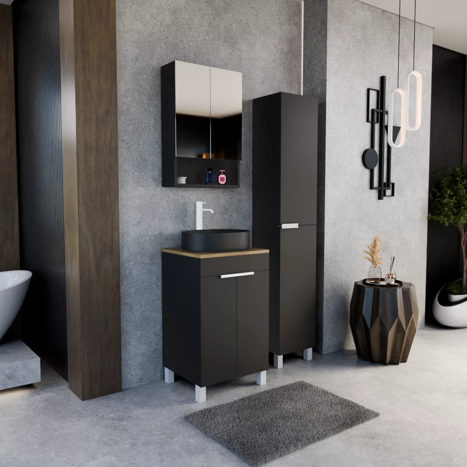 HD Paris Matt Black 50 komplett fürdőszoba bútor szett álló mosdószekrénnyel, matt fehér elemekkel, tölgyfa színű mosdópulttal, tükrös szekrénnyel és magasszekrénnyel