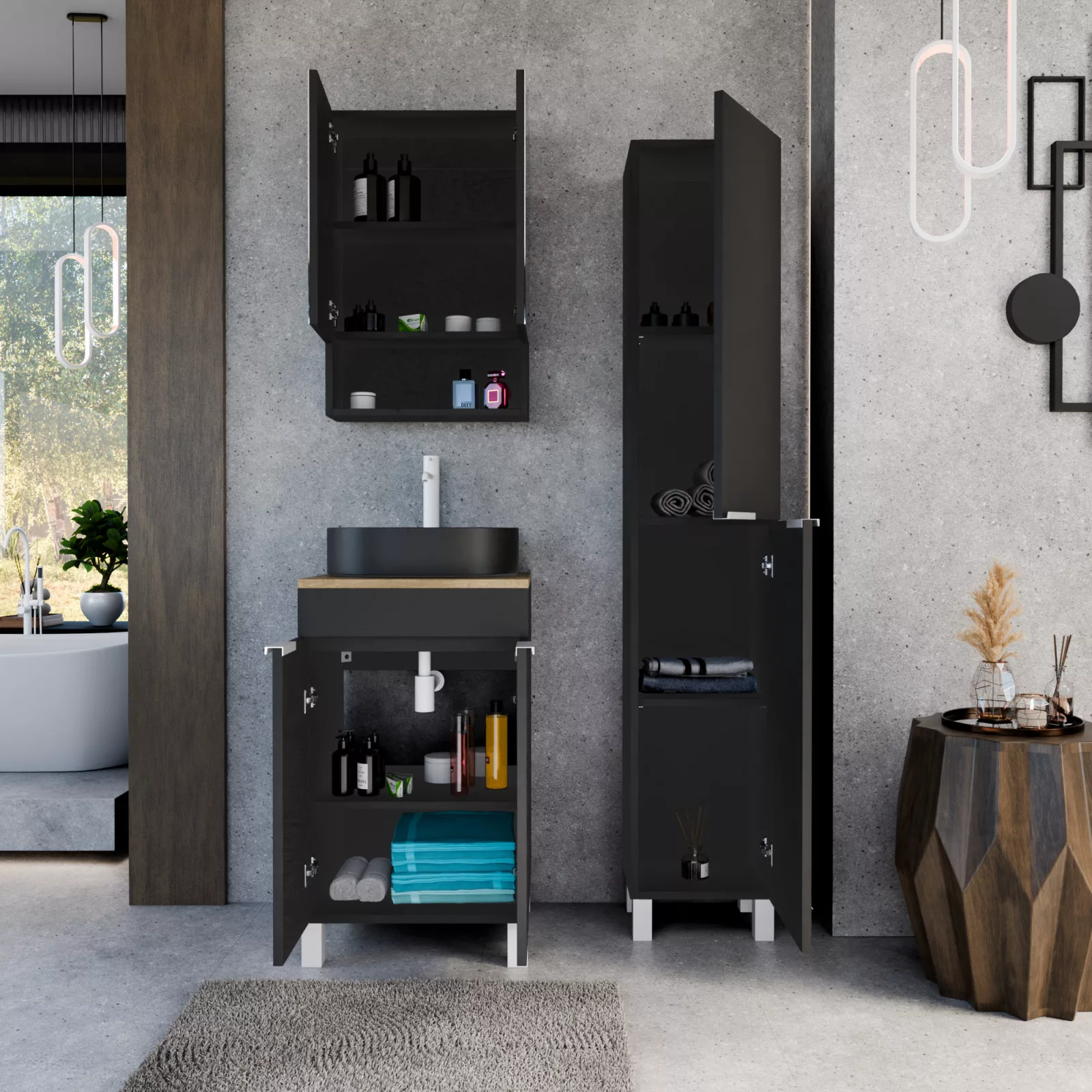 Napjainkban a praktikum mellett a fürdőszoba esztétikus megjelenése is fontos szempont. A lábon álló bútorok egyre elterjedtebbé válnak, mivel számos előnnyel rendelkeznek, ide sorolható a modern, könnyed megjelenés és az egyszerű tisztítás. A lábon álló fürdőszobai bútorok a klasszikus és modernebb stílusú fürdőszobákban is megállják a helyüket egyaránt. Nagyfokú rugalmasság jellemzi őket, mivel szinte bárhol elhelyezhetők a fürdőszobán belül. További előnyük, hogy soft close (csillapítós) zsanérral felszereltek, így  becsukáskor az ajtó vagy fiók finoman záródik be, csökkentve a terhelést és növelve az élettartamot. A szekrény fehér és matt fekete mosdóval, illetve mosdópulttal is szabadon kombinálható ízlés szerint. A teljesség érdekében a mosdószekrényekhez illő tükrös szekrényt és magasszekrényt is választhatunk, hogy a fürdőszobában lévő bútorok egy szemet gyönyörködtető egységet alkossanak.