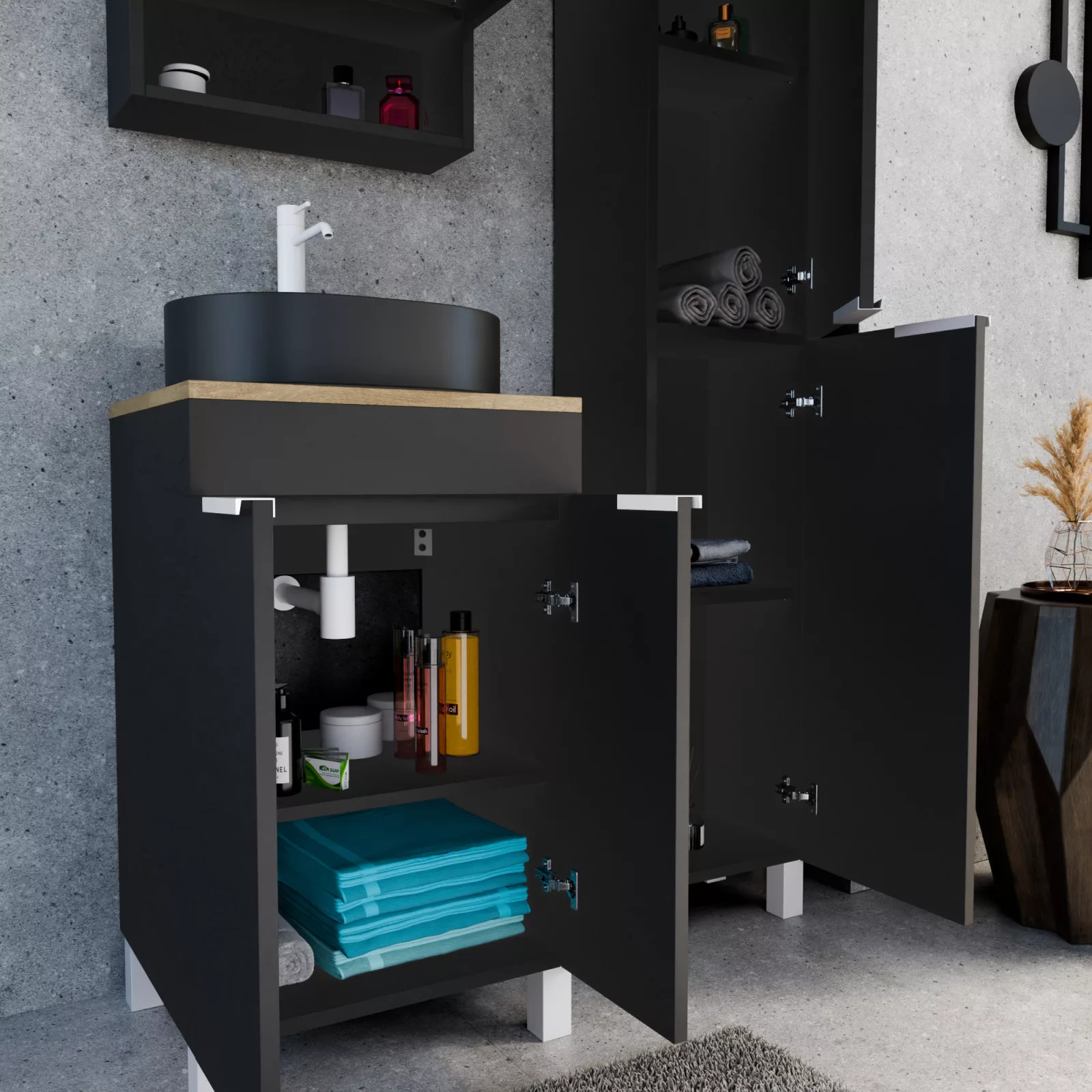 • matt fekete mosdószekrény, kivehető polccal