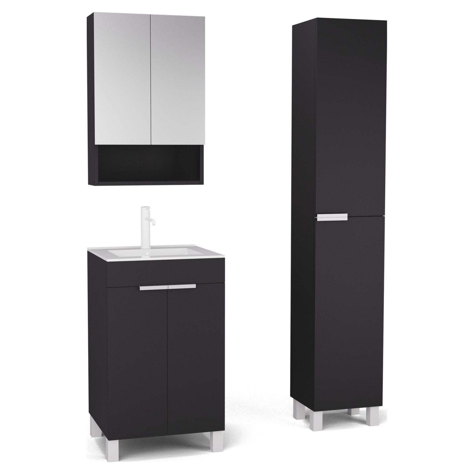 HD Paris Matt Black 50 komplett fürdőszoba bútor szett álló mosdószekrénnyel, matt fehér elemekkel, tükrös szekrénnyel és magasszekrénnyel