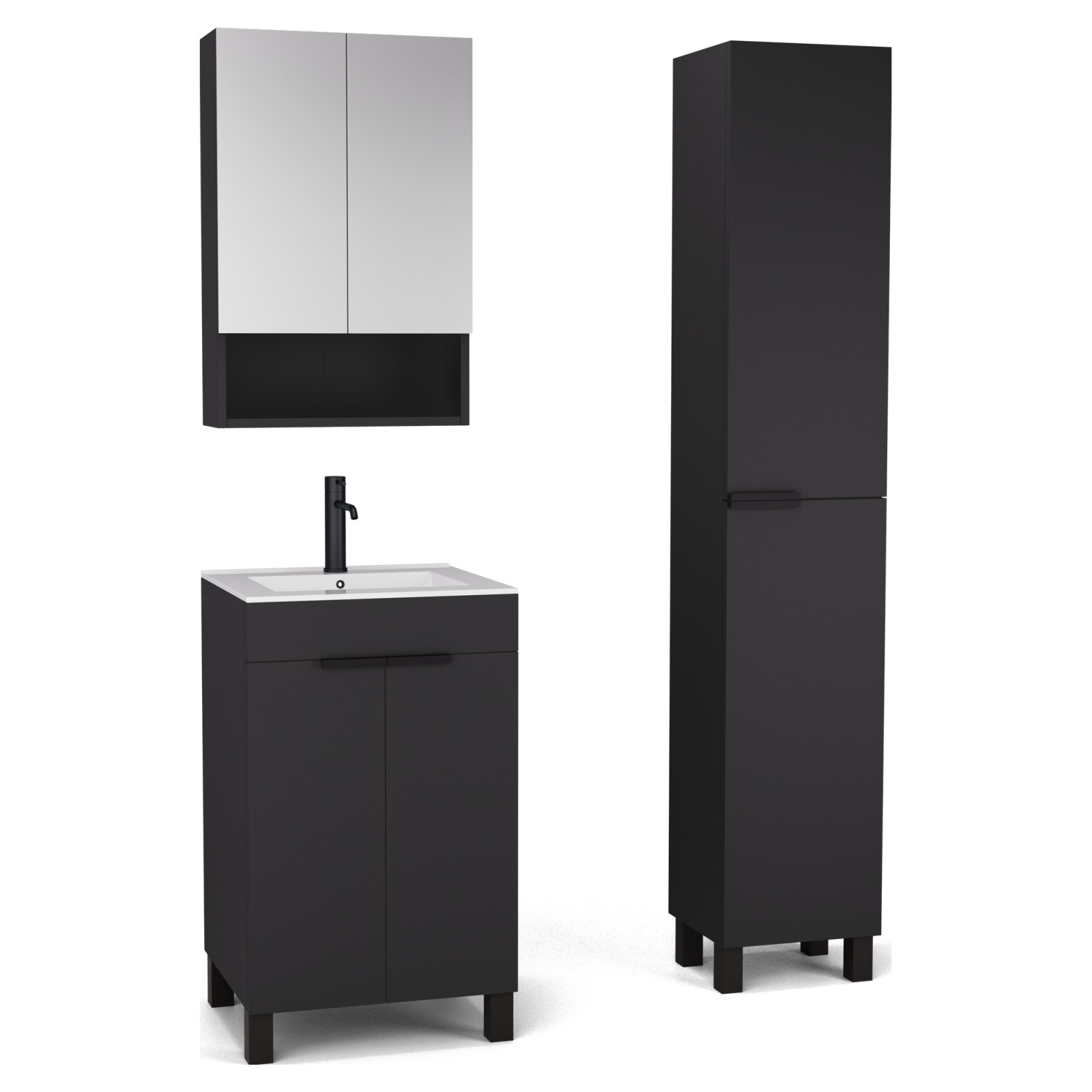 Saját márkás 50 cm széles komplett fürdőszoba bútor álló mosdószekrénnyel matt fekete színben, matt fekete fogantyúkkal és lábakkal, tükrös szekrénnyel és magasszekrénnyel.
