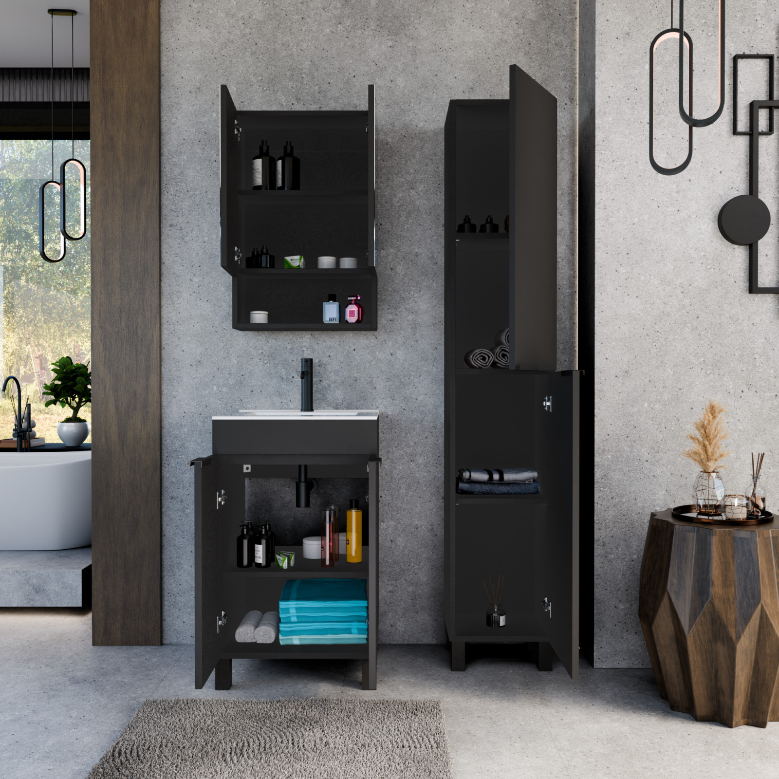 HD Paris Matt Black 50 komplett fürdőszoba bútor szett álló mosdószekrénnyel, matt fekete elemekkel, fényes fehér slim mosdóval, tükrös szekrénnyel és magasszekrénnyel