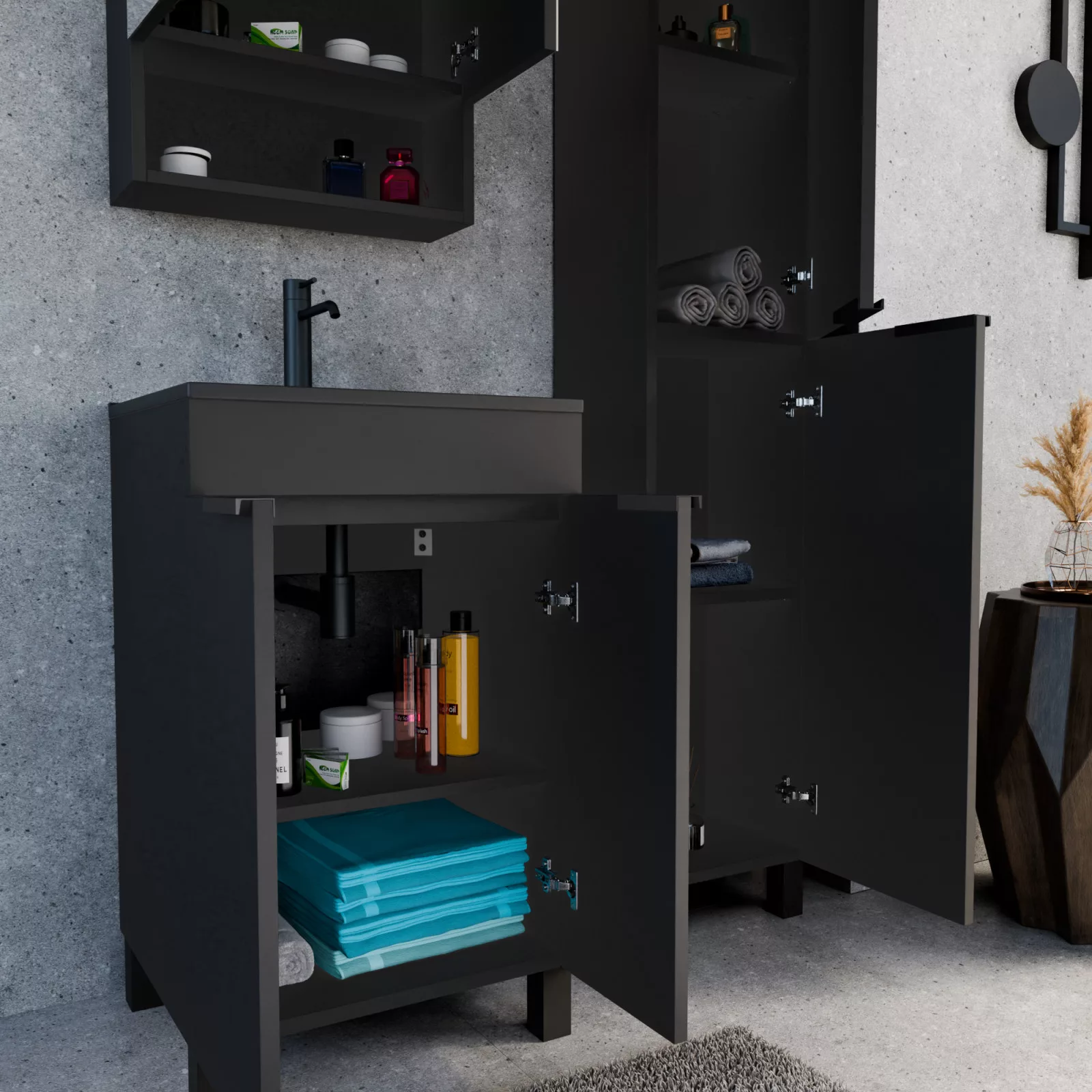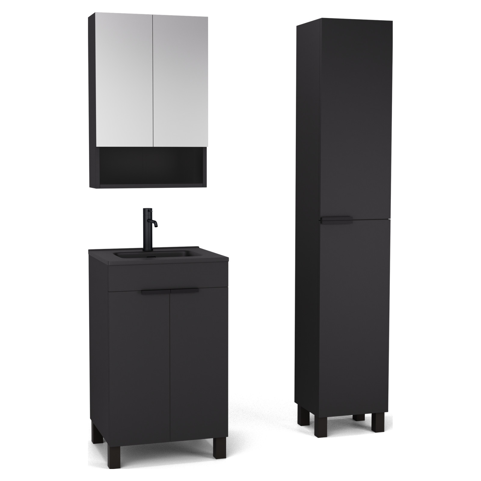 Saját márkás 50 cm széles komplett fürdőszoba bútor álló mosdószekrénnyel matt fekete színben, matt fekete fogantyúkkal és lábakkal, tükrös szekrénnyel és magasszekrénnyel.