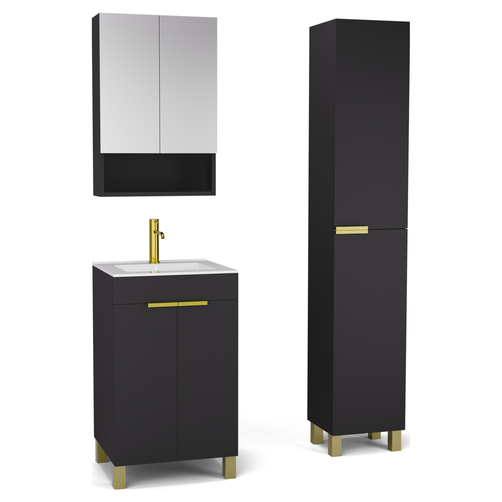 Saját márkás 50 cm széles komplett fürdőszoba bútor álló mosdószekrénnyel matt fekete színben, szálcsiszolt arany fogantyúkkal és lábakkal, tükrös szekrénnyel és magasszekrénnyel.