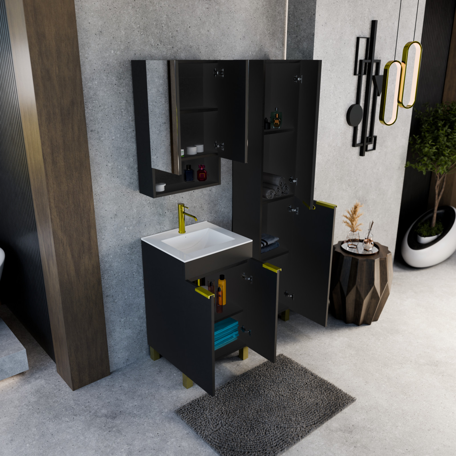 HD Paris Matt Black 50 komplett fürdőszoba bútor szett álló mosdószekrénnyel, szálcsiszolt arany elemekkel, fényes fehér slim mosdóval, tükrös szekrénnyel és magasszekrénnyel